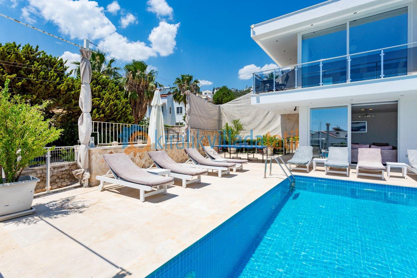 Bu ilan ait Detaylı açıklama ve bilinmesi gereken detaylarKalkan Akbel mevkiinde, panoramik deniz manzarasına hâkim ve merkeze yakın konumda yer alan bu lüks villa; modern mimarisi ve geniş yaşam alanlarıyla konforlu bir tatil arayan misafirler için tasarlanmıştır. Dört süit yatak odalı planıyla 8 kişilik konaklama kapasitesi sunan villa, deniz manzaralı villa arayışında olan geniş aileler ve arkadaş grupları için ideal bir kiralık villa seçeneğidir.