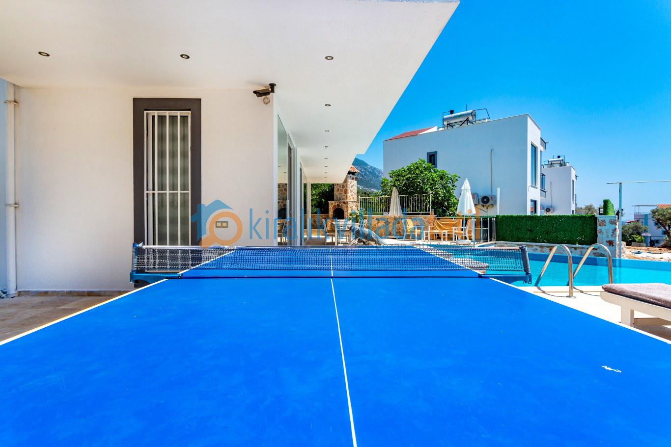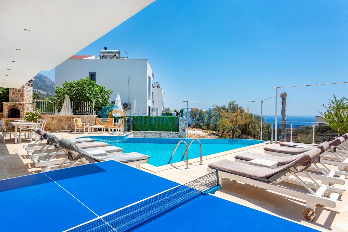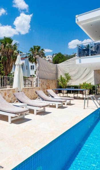 Geniş havuz terası, deniz manzarasına karşı keyifli vakit geçirmek için uygundur. Terasta yüzme havuzu, şezlonglar, oturma alanı, manzaraya karşı yemek masası ve barbekü köşesi bulunur. Akşam saatlerinde gün batımı eşliğinde geçirilen zamanlar villanın en özel anlarını oluşturur.