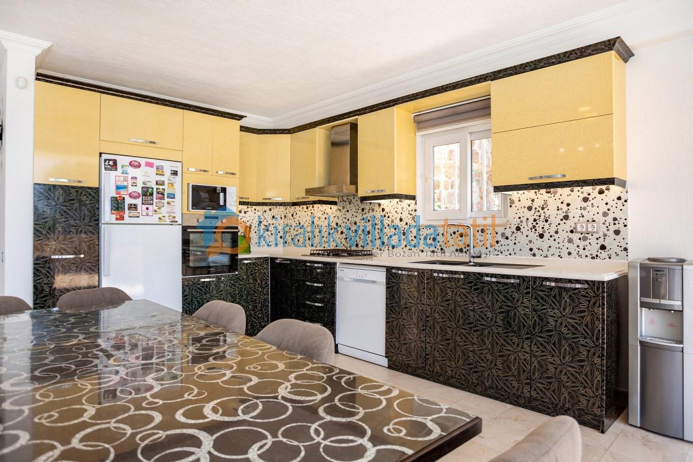 Açık plan salon ve geniş Amerikan mutfak alanı ferah bir kullanım sağlar. Mutfakta buzdolabı, bulaşık makinesi, fırın, ocak, tencere–tava seti, servis takımları ve çay–kahve ekipmanları eksiksiz şekilde mevcuttur. Salon bölümünden geniş sürgülü cam kapılar aracılığıyla havuz terasına doğrudan çıkış sağlanır ve yaşam alanı gün boyu doğal ışık alır.