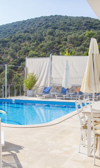 Villamızın geniş havuz terası, kısmen korunaklı yapısıyla özellikle gözlerden uzak, sakin bir tatil arayan aileler için güzel bir alternatiftir. Havuz başında şezlonglarda güneşlenebilir, akşam saatlerinde ise Akdeniz’in büyüleyici gün batımını sevdiklerinizle birlikte izleyebilirsiniz. Bahçede barbekü alanı, yemek masası ve oturma köşesi de bulunur.