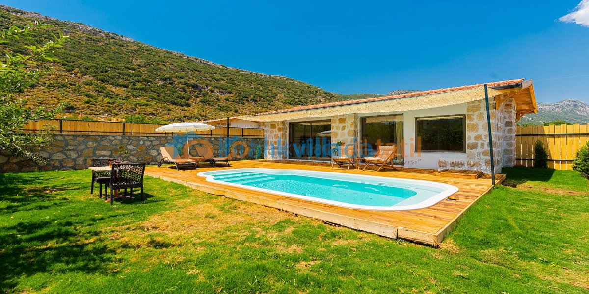 Tamamen taş ve ahşap konsept ile inşa edilen villamız havuz terası taş duvarlar ile kapatılarak muhafazakar hale getirilerek gözlerden uzak doğa ile baş başa huzur dolu bir tatil imkanı sunmaktadır.