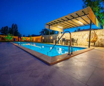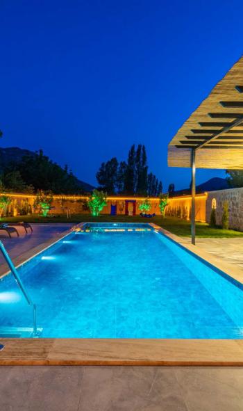 Özel yüzme havuzuna sahip olan kiralık villamızın bahçe ve havuz terasında sevdikleriniz ile keyifli bir tatil geçirebilirsiniz. Havuz terasına açılan amerikan mutfak-salonunda misafirlerimizin ihtiyaç duyabileceği birçok şey düşünülmüştür.