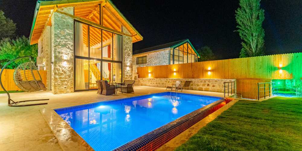 Villanın dış alanında yer alan özel yüzme havuzu ise tatilinize ayrı bir keyif katmaktadır. havuz ölçüleri 3,5 metre genişliğinde 7 metre uzunluğunda ve 1.40 metre derinliğindedir. Havuz başında güneşlenebilir ve doğa manzarası eşliğinde huzurlu anlar yaşayabilrsiniz. Villanın geniş ve yeşil bahçesi ise doğa içerisinde dinlenebileceğiniz keyifli bir alan sunmaktadır.