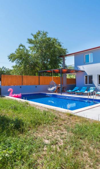 Villamızın korunaklı bahçesi ve özel havuzu, dışarıdan görünmeyecek şekilde tasarlandığından, mahremiyetine önem veren misafirler için güvenli ve rahat bir ortam sağlar. Geniş havuz terasında güneşlenebilir, barbekü alanında sevdiklerinizle keyifli akşamlar geçirebilir ya da bahçedeki oyun filesiyle eğlenceli dakikalar yaşayabilirsiniz.