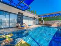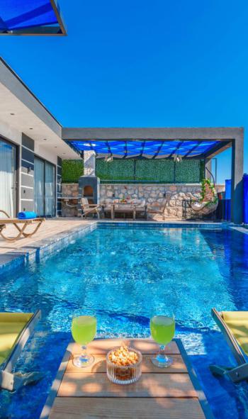 Villanın en dikkat çekici özelliklerinden biri ise tam korunaklı özel yüzme havuzu ve jakuzili alanlarıdır. Havuz terası dışarıdan görünmeyecek biçimde düzenlenmiş olup, mahremiyetine önem veren misafirler için huzurlu bir ortam oluşturur. Güneşlenmek, serinlemek ya da gün batımında sevdiklerinizle barbekü keyfi yapmak için mükemmel bir atmosfere sahiptir.