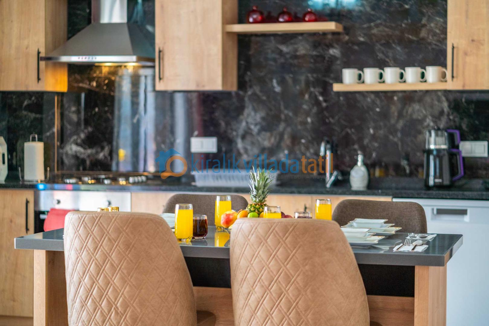 Ortak Alanlar Salon: Ferah ve modern bir dekora sahip salon alanında, konforlu bir oturma grubu, klima, TV, internet bağlantısı için modem ve havuz terasına doğrudan çıkış bulunmaktadır. Mutfak: Amerikan mutfak konseptine sahip villamızda, ihtiyacınız olan tüm mutfak gereçleri mevcuttur. Mutfakta buzdolabı, bulaşık makinesi, çamaşır makinesi, fırın, 4’lü ocak seti, mikrodalga fırın, kettle, yemek takımları, pişirme gereçleri ve 4 kişilik yemek masası ile sandalyeler yer almaktadır.