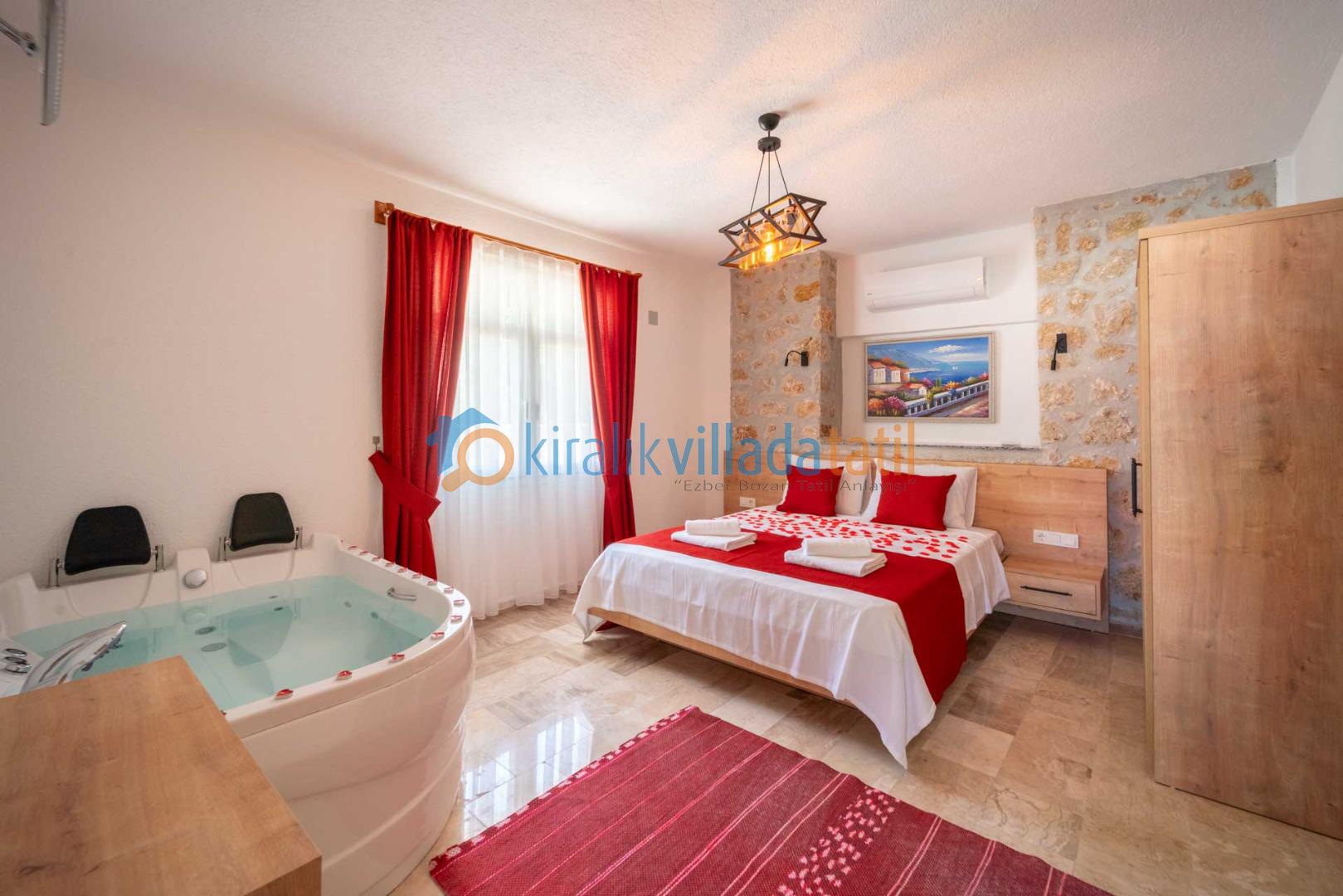 Yatak Odaları 1. Yatak Odası (Suit Aile Odası): Şık ve konforlu bir atmosfere sahip olan ana yatak odasında, 1 adet çift kişilik yatak, komodin, kıyafet dolabı, makyaj masası, klima, özel jakuzi, banyo/WC ve doğa manzaralı bir balkon bulunmaktadır.