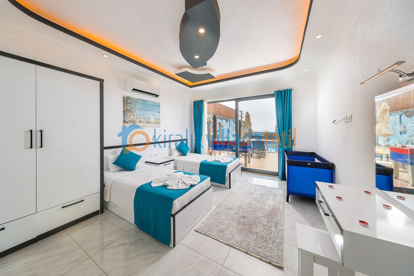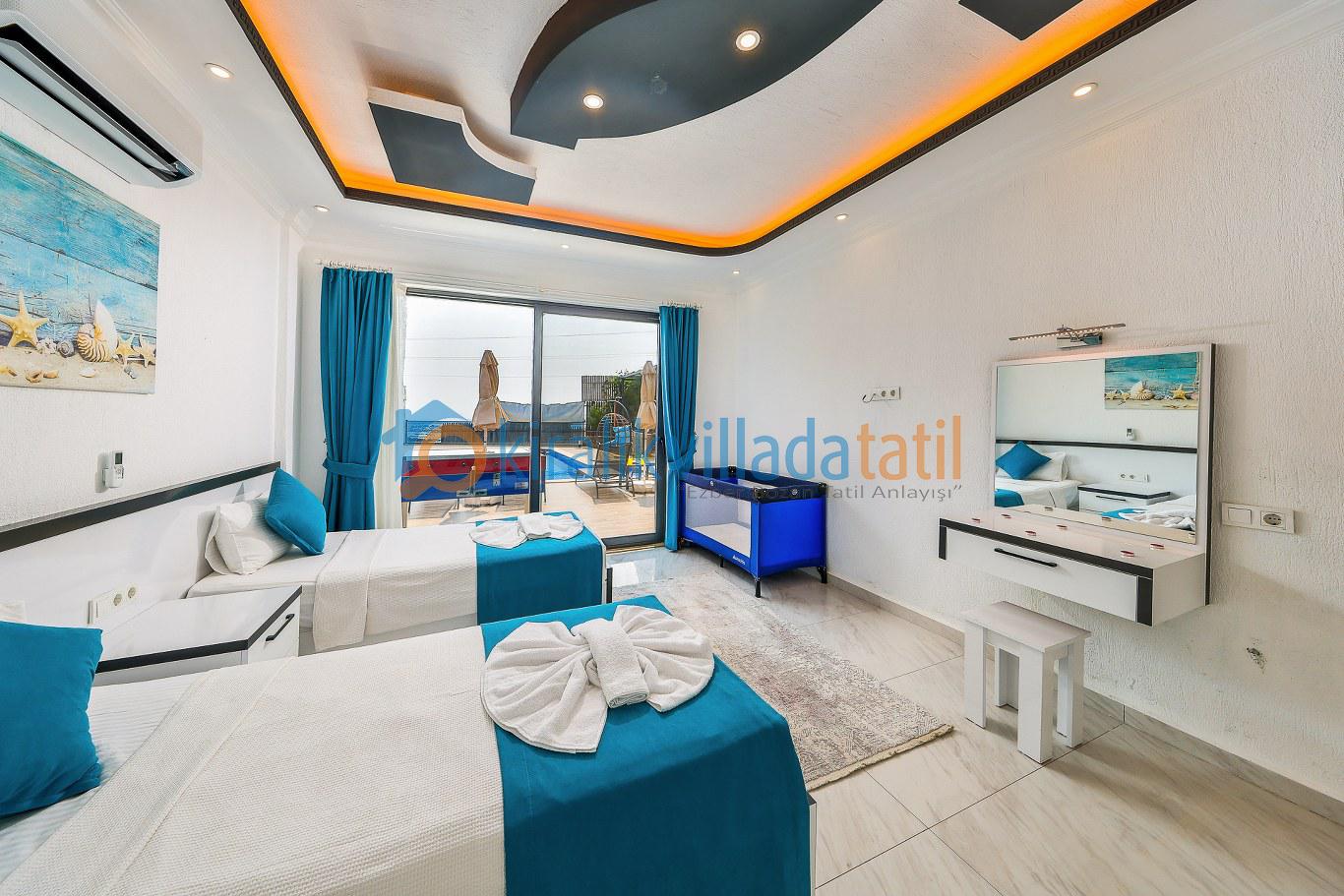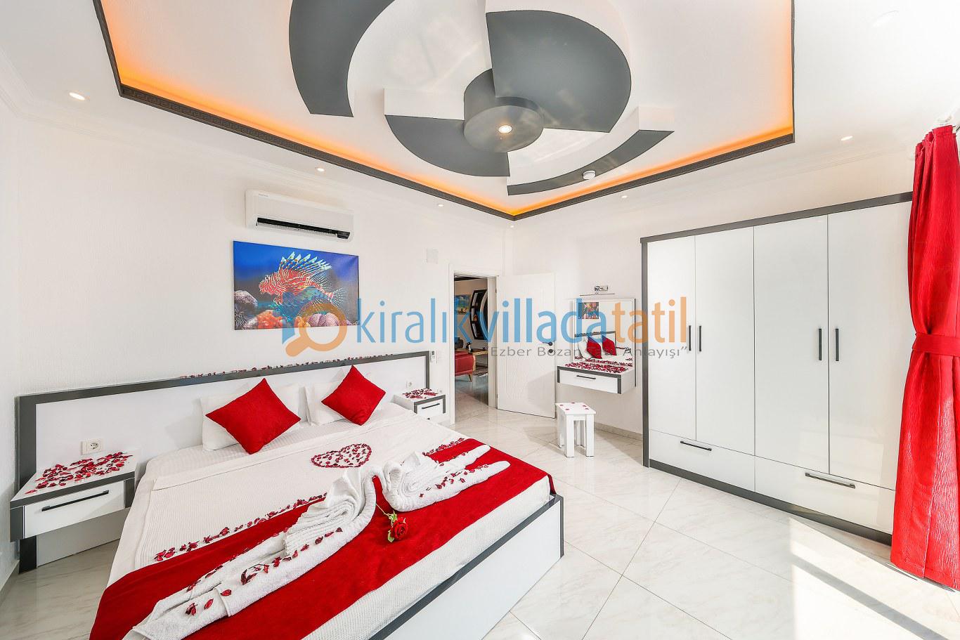 İki yatak odası bulunan villanın, ana yatak odasında çift kişilik yatak, diğer yatak odasında ise, iki adet tek kişilik yatak mevcut olup, yatak odalarının kendilerine ait oda eşyaları ve banyo-wc'si bulunmaktadır.