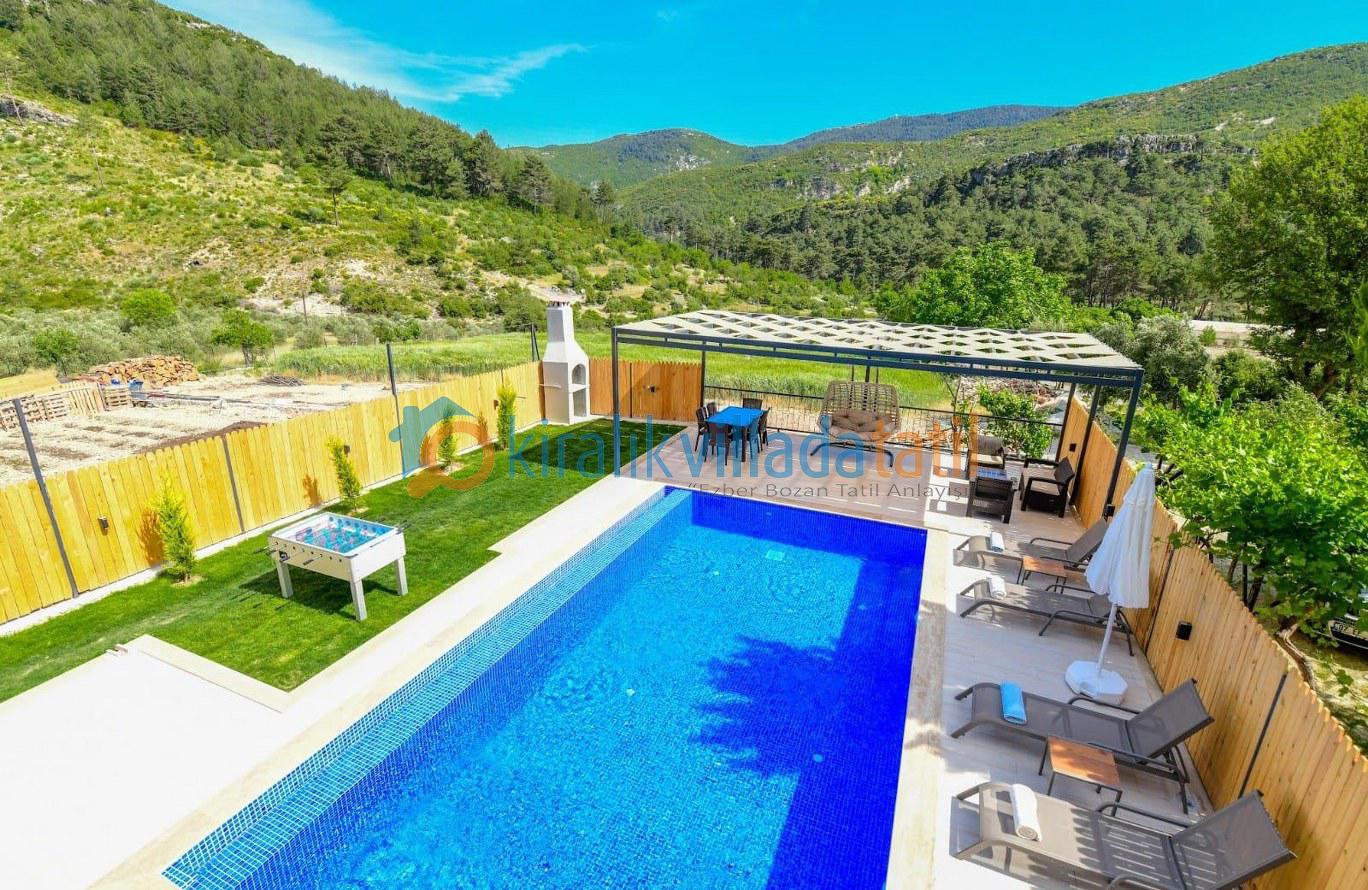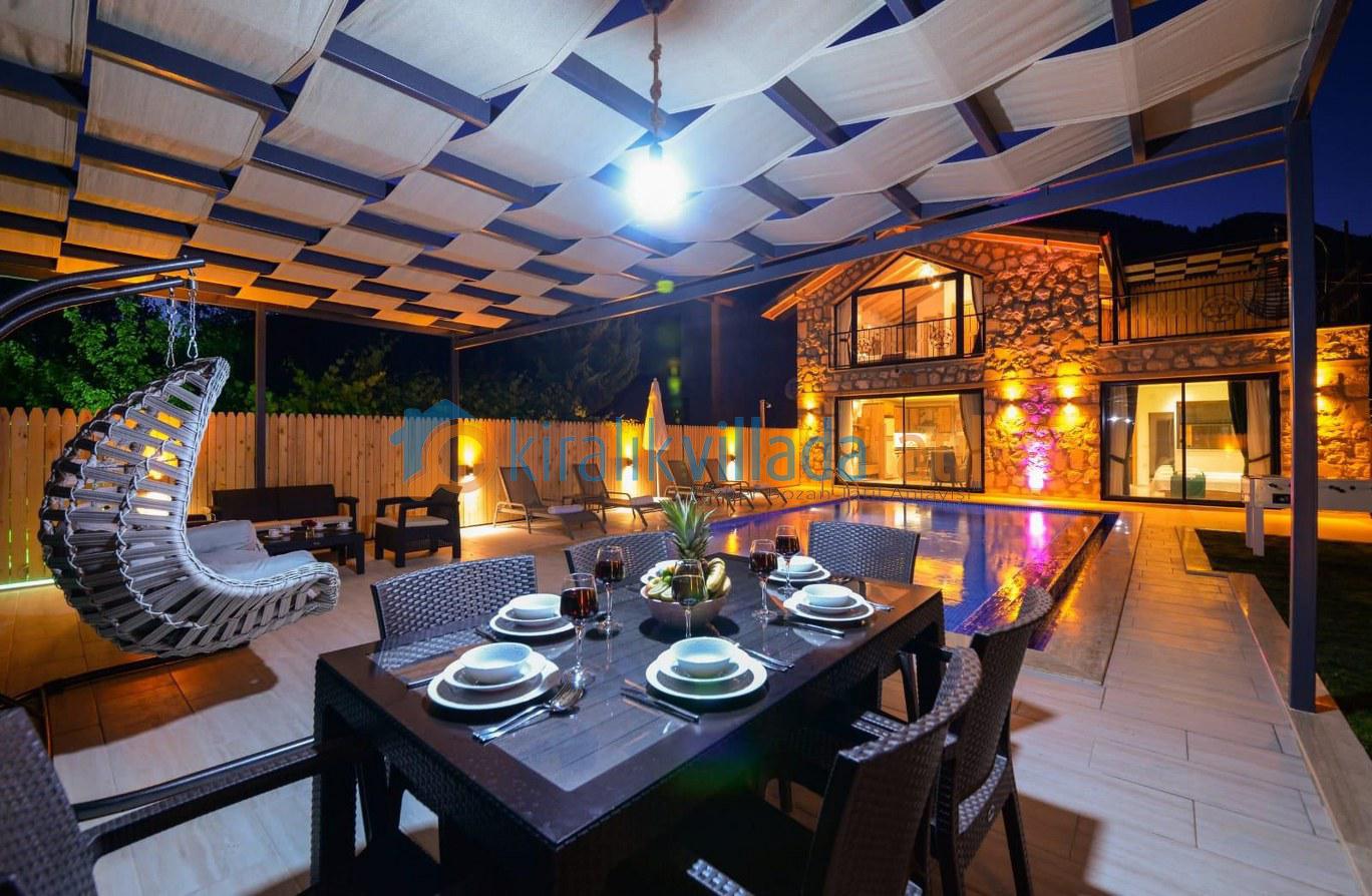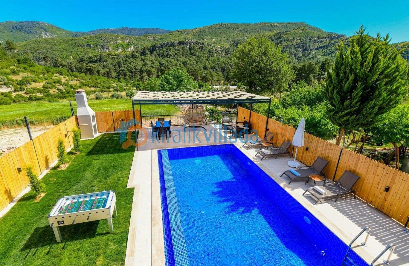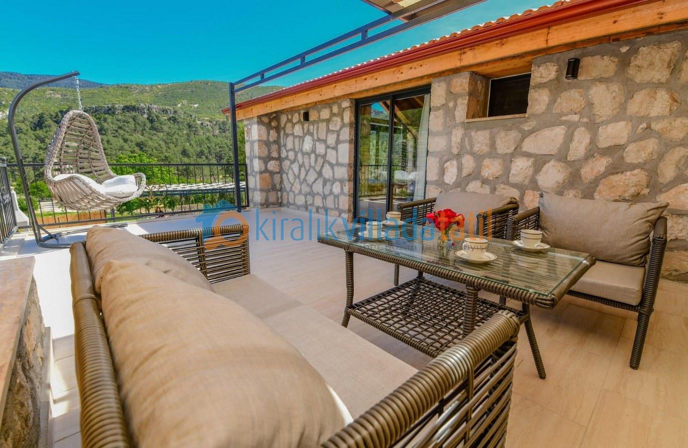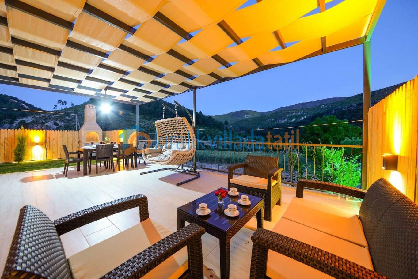 Doğa ile iç içe bir konumda bulunan villamızın bahçesinde salıncak ve langırt gibi eğlence olanakları mevcuttur. Taş ve ahşap işçiliğiyle dikkat çeken villamız, konforlu ve lüks bir şekilde döşenmiştir.