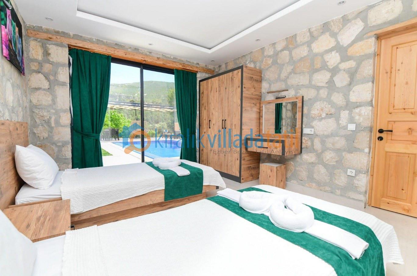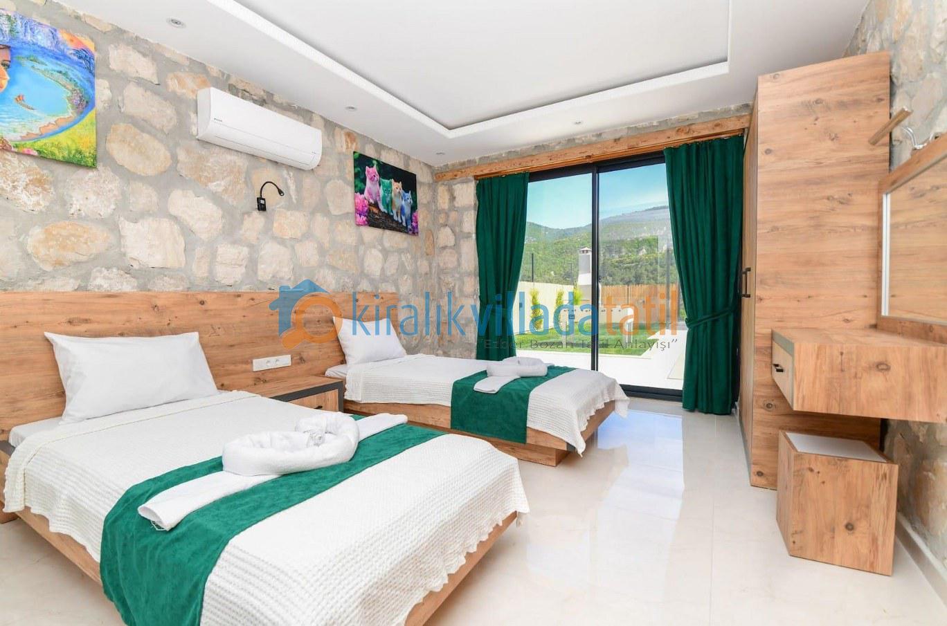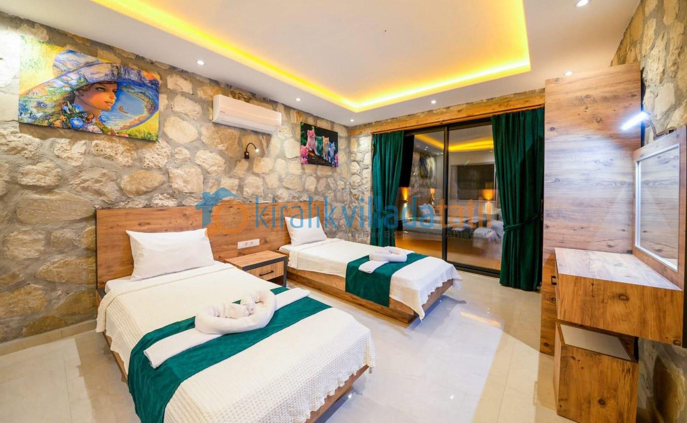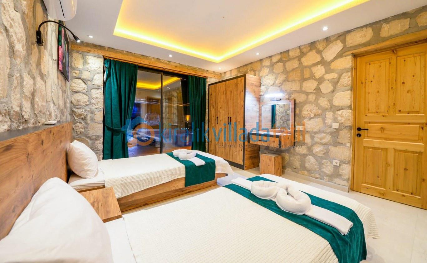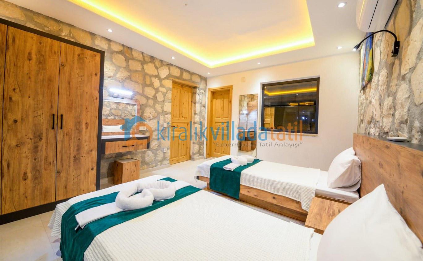 2. Yatak Odası: İki adet tek kişilik yatak, klima, elbise dolabı, komodin, makyaj masası, özel banyo ve tuvalet bulunmaktadır.