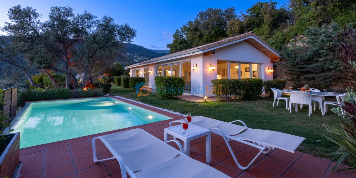 Villanın çevresinin görünmemesi, sessiz ve huzurlu bir ortamda konaklama arayan misafirler için ideal bir seçenek sunmaktadır. Villamız, yemyeşil bir doğanın ortasında yer almakta olup, küçük ama oldukça şirin bir bahçeye ve eşsiz bir deniz manzarasına sahiptir.