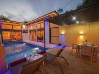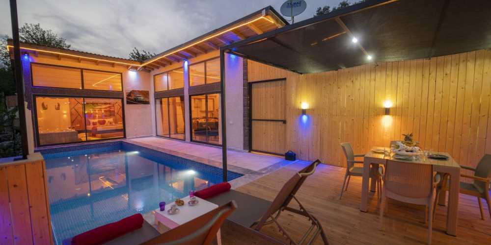 Villanın dış alanında bulunan tamamen korunaklı özel yüzme havuzu, muhafazakâr balayı çiftleri için maksimum gizlilik sağlayacak şekilde planlanmıştır. Havuz terasında yer alan dinlenme alanları ve doğa ile iç içe huzurlu ambiyans, tatilin her anını özel ve unutulmaz kılar. Ayrıca banyoda bulunan ısıtmalı göbek taşı, özellikle serin dönemlerde konfor seviyesini artıran önemli bir ayrıcalık olarak öne çıkar.