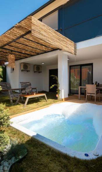 Modern mobilyalarla zevkli bir şekilde döşenmiş olan villa, konforlu ve keyifli bir tatil sunar. Havuz alanı dışarıdan görünmeyecek şekilde dizayn edilmiştir ve bu sayede muhafazakâr aileler için uygundur.