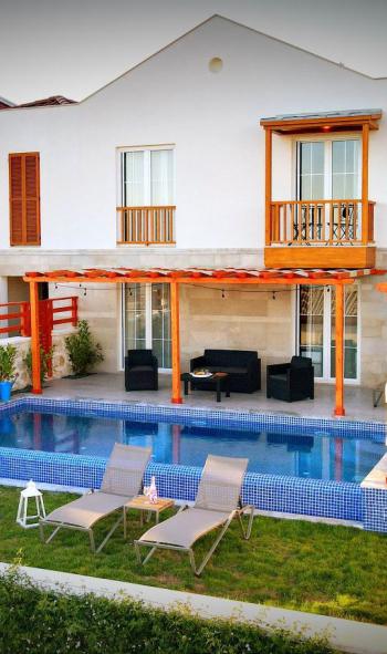 Villamızda 2 adet yatak odası ve 3 banyo bulunmaktadır. Bir yatak odasında iki tek kişilik yatak,banyo ve klima bulunmaktadır.İkinci yatak odasında bir adet çift kişilik yatak ve klima bulunmaktadır.Salon içerisinde mutfak, oturma grubu,televizyon, wc ve klima mevcuttur.Ayrıca girişte bir banyomuz bulunmaktadır.Bahçede misafirlerimiz için özel locamız bulunmaktadır.