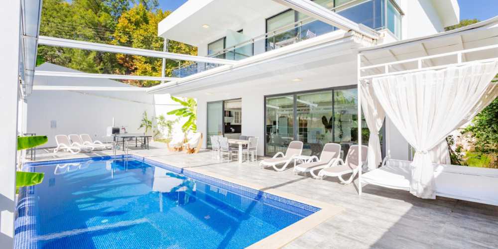 2018 yılında ilk kez misafir ağırlamaya başlayan villamız modern mimarisi kullanışlı iç alanları ve tatil süresince ihtiyaç duyulabilecek ekipmanlarıyla konforlu bir konaklama imkanı sunar. Havuz terası perde sistemiyle kapatılmış olup dışarıdan görünürlüğü büyük ölçüde azaltılmıştır. Bu özelliğiyle korunaklı villa ve muhafazakar villa arayan aileler için rahat kullanılabilecek bir tatil alanı oluşturur