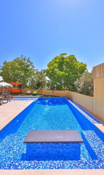 Bahçe : Bahçe içerisinde korunaklı özel yüzme havuzu, şezlong ve şemsiye, çardak, yemek masası ve sandalyeler, bahçe oturma grubu, salıncak ve mangal / barbekü yer almaktadır.