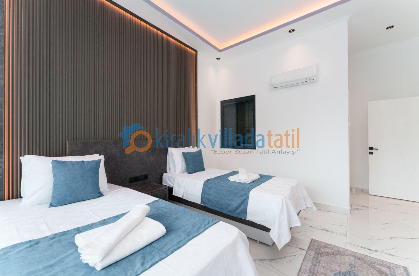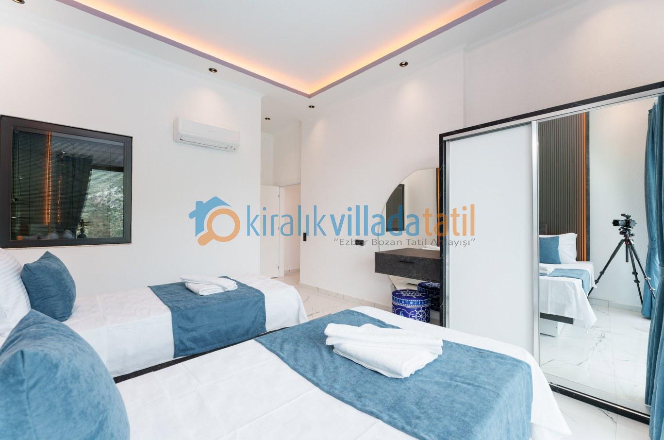 İki tek kişilik yatak, klima, makyaj masası, elbise dolabı ve özel banyo & WC yer alır. Bu odadan da havuz terasına çıkılabilir.