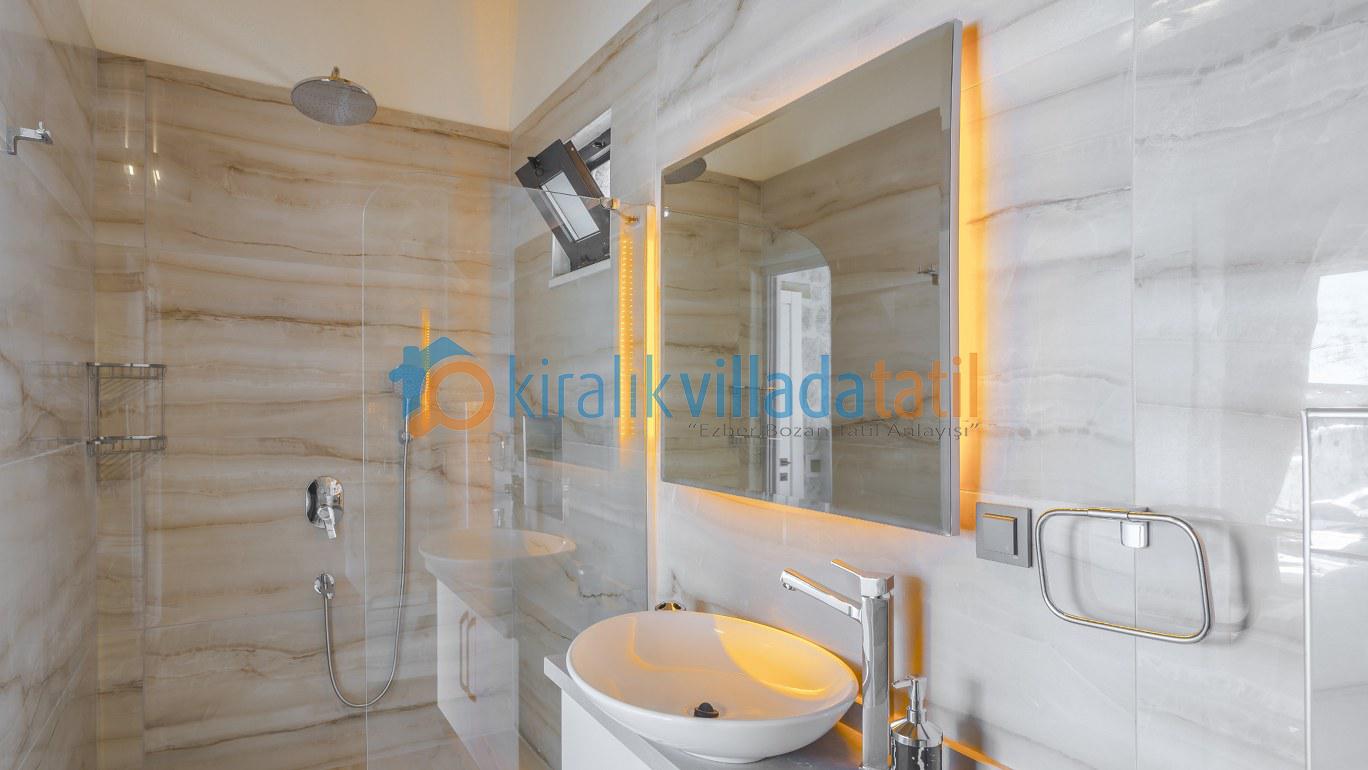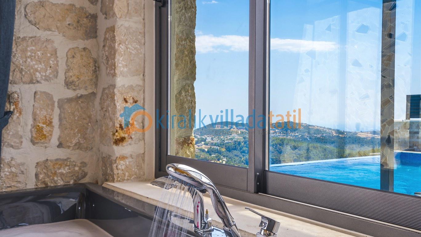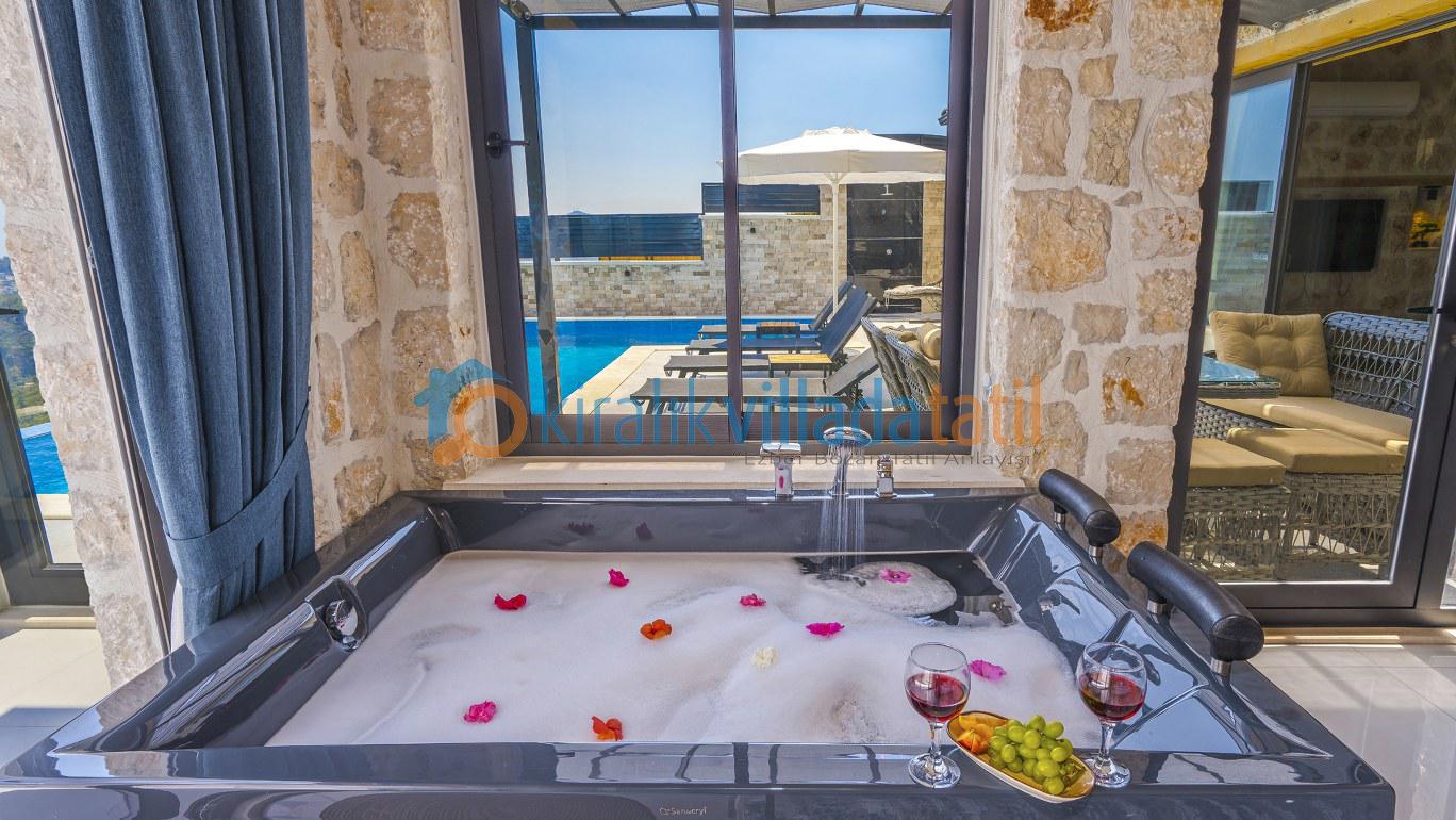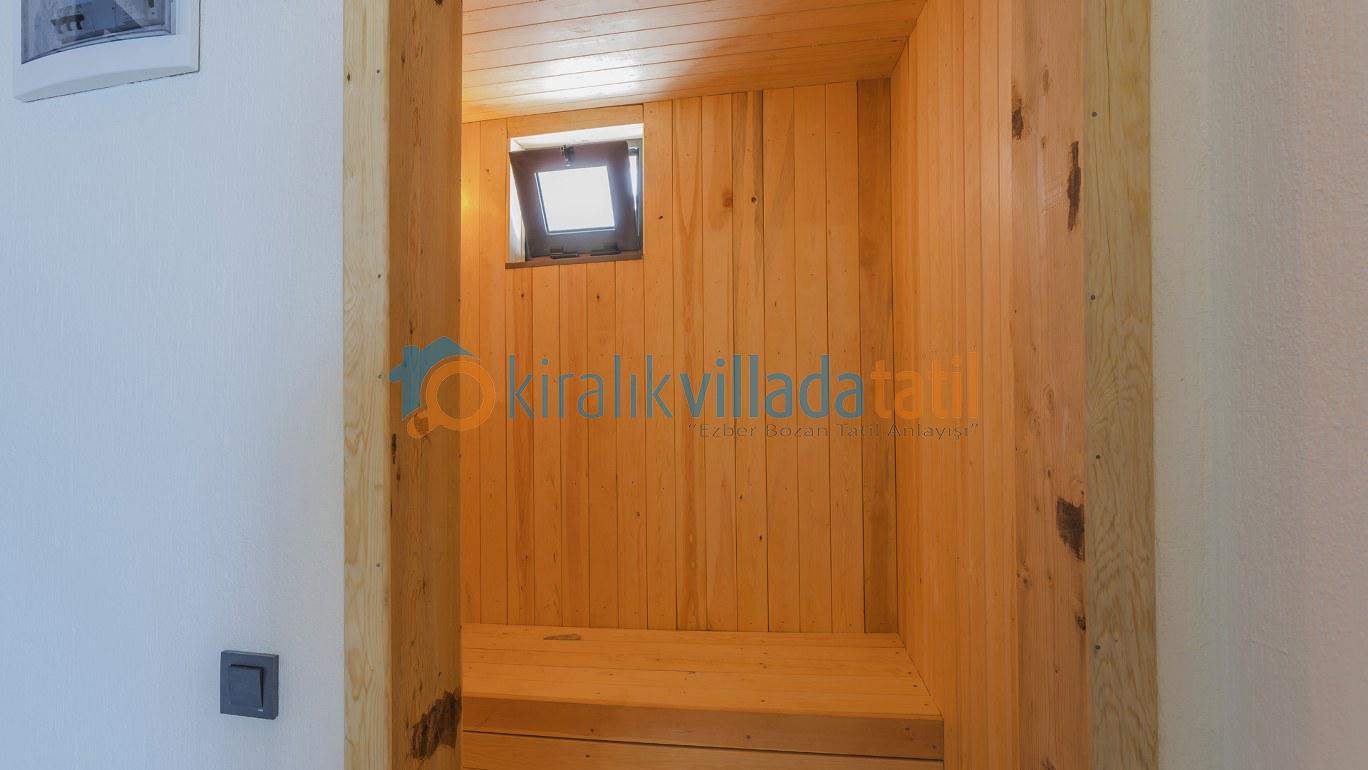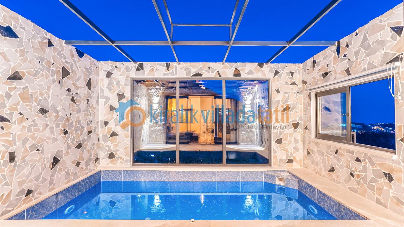 Dış havuzunun tamamen korunaklı olması, mahremiyete önem veren misafirler için güvenli ve konforlu bir alan sunarken; içeride bulunan kapalı ısıtmalı havuz, bu konaklamayı dört mevsim yapılabilir hale getirir. Sauna, jakuzi ve hamam gibi özel donatılar ise bu evi bölgede öne çıkan bir lüks villa haline getirir.