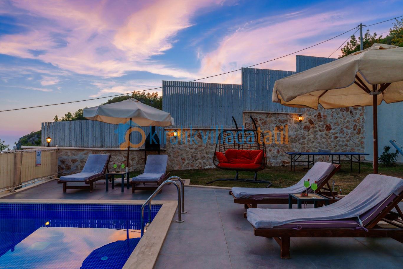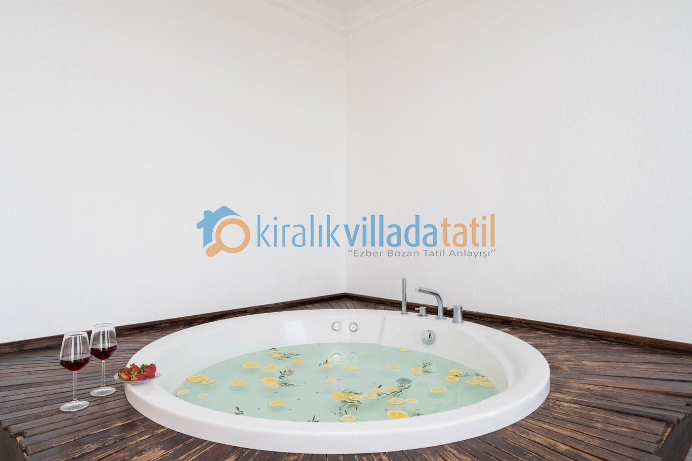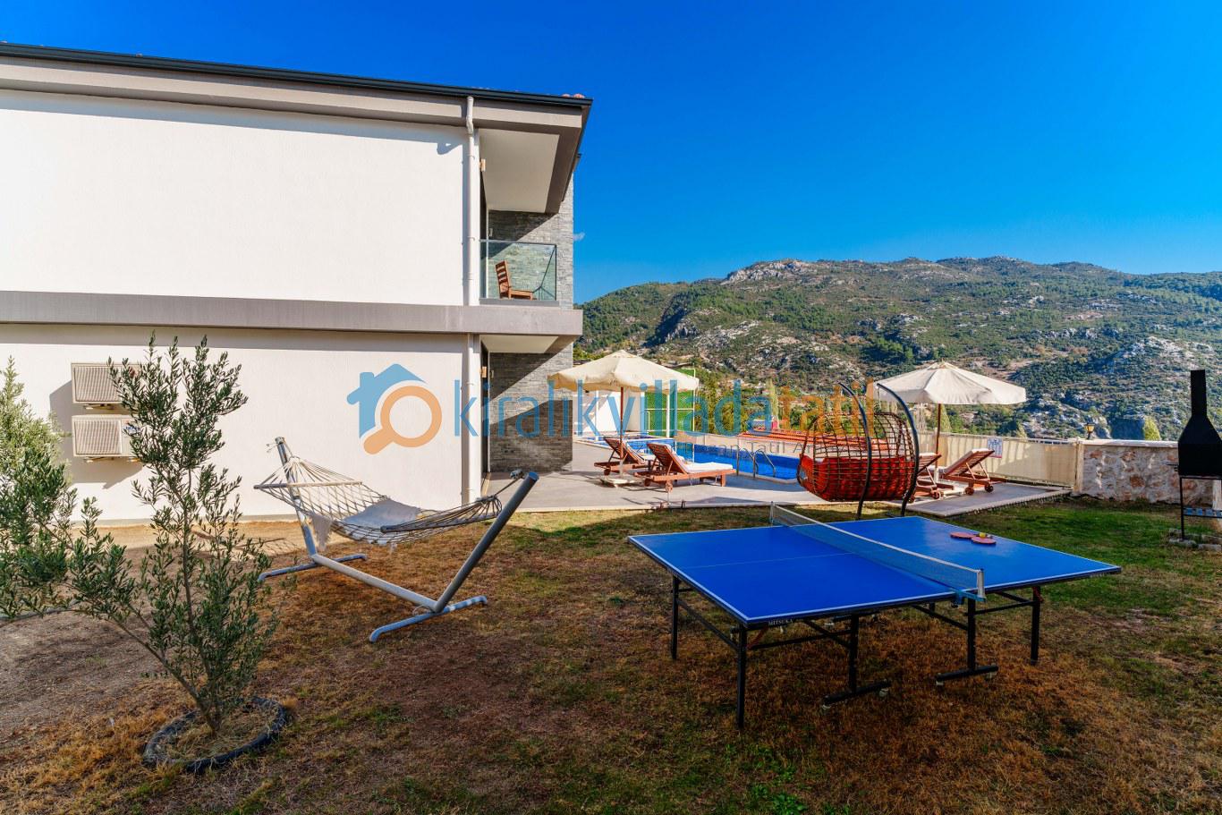 Villanın içerisinde yer alan özel jakuzi, günün yorgunluğunu atmak isteyen misafirler için keyifli bir alan yaratır. Geniş bahçede bulunan hamak, salıncak ve açık hava oturma alanları, doğanın içinde huzurlu vakit geçirmek isteyen tatilciler için mükemmel bir atmosfer sunar. Ayrıca villa içinde bulunan masa tenisi alanı, eğlence arayan konuklara hoş bir alternatif sağlar.