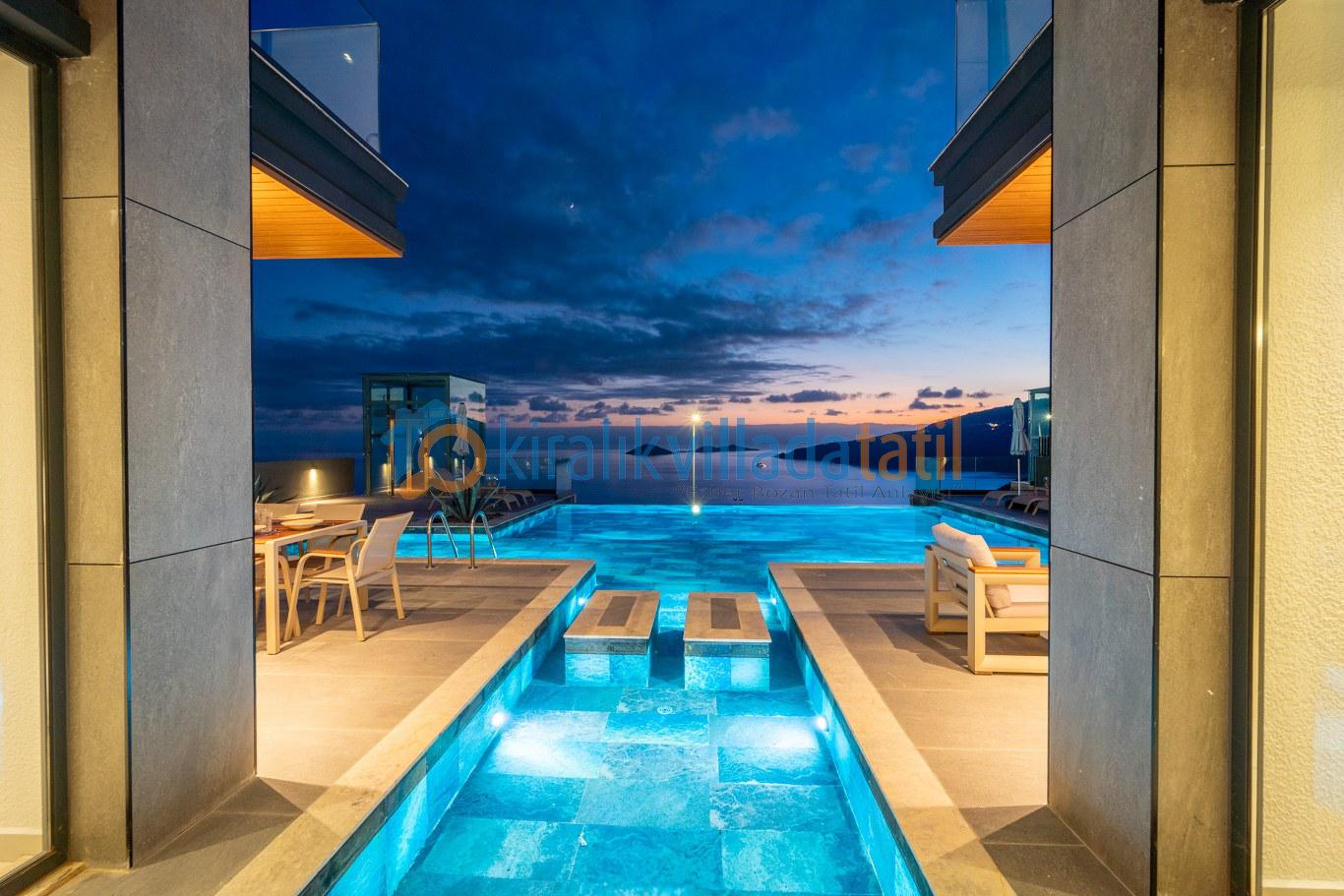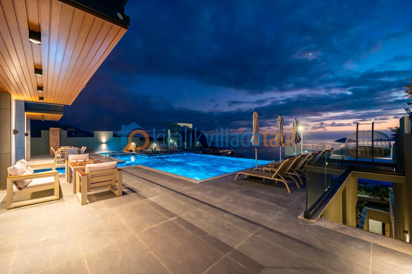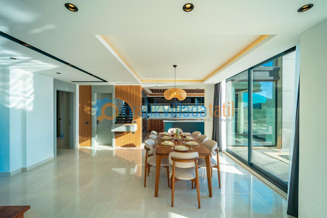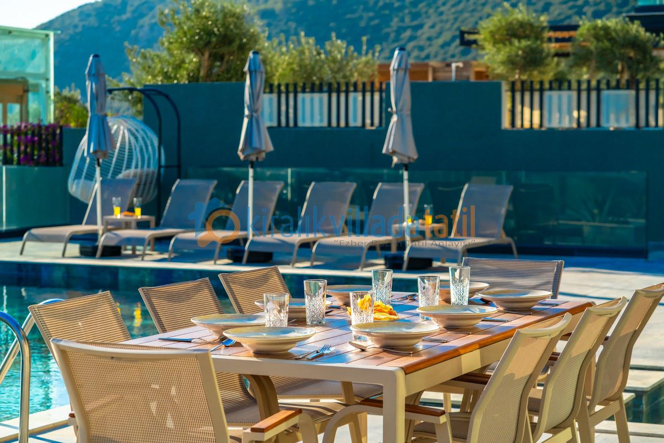 Villanın geniş yüzme havuzu, Kalamar Koyu’nun turkuaz denizine hakim panoramik bir manzaraya sahiptir. Gün boyu güneş alan havuz terası, modern şezlong takımı, özel oturma alanları ve barbekü bölümüyle misafirlerine ayrıcalıklı bir dış mekân atmosferi sunar. Manzaraya karşı yapılan kahvaltılar, gün batımı eşliğinde geçirilen akşamlar ve havuz başında dinlenme anları bu villada tatilinizi unutulmaz kılar.