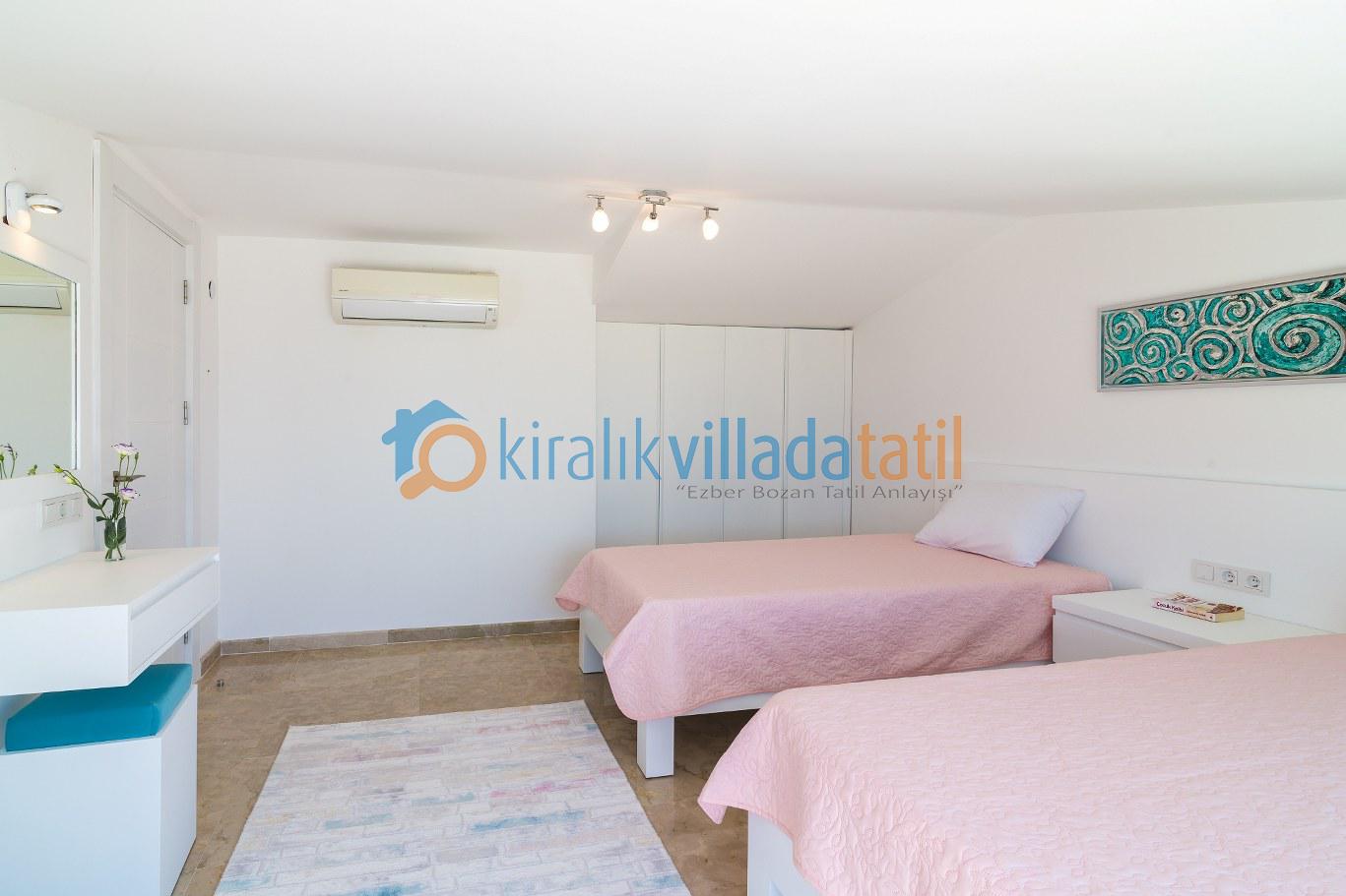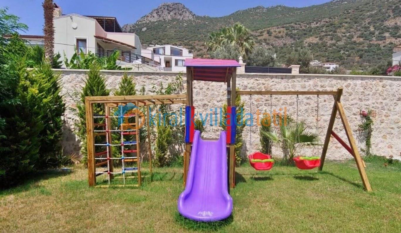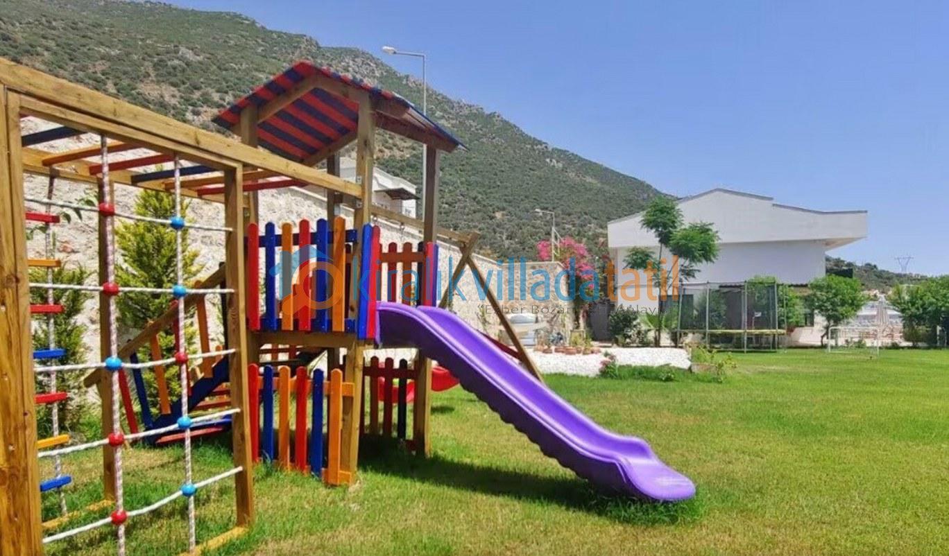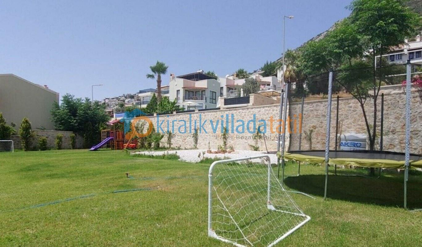 Bu ilan ait Detaylı açıklama ve bilinmesi gereken detaylarKalkan Kızıltaş mevkiinde bulunan bu tatil villası 5 yatak odası ile 10 kişilik kapasiteye sahiptir. Şehir merkezine yakınlığı ile ön plana çıkan villamızda 3 adet çift kişilik yatak, 4 adette tek kişilik yatak bulunmaktadır. Giriş katında açık plan geniş bir mutfak, oturma odası, ortak WC, 1 adet çift kişilik yatak odası ve havuz terasına çıkış bulunmaktadır. 2.katta ise 2 adet çift kişilik banyolu ebeveyn yatak odası, çatı katında ise 2 adet tek kişilik yatakların bulunduğu genç yatak odaları bulunmaktadır. Çatı katındaki banyo wc ortak kullanımdır.Villamızın terasında çocuklarınızda eğlenebileceği oyun alanı mevcuttur Villamzın muteşem deniz manzarası vardır .