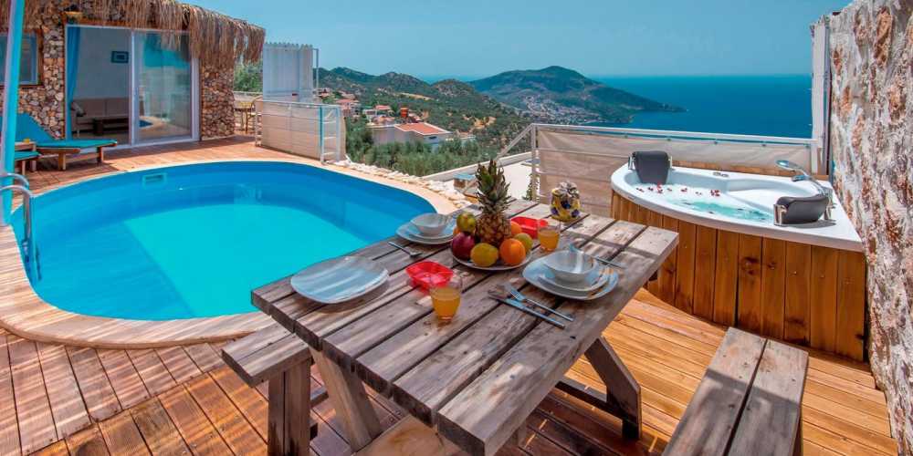 Villamızın bütün odaları ve havuz terası muhteşem Kalkan koyu manzarasına bakmaktadır. Villanın her yerinden bu manzarayı görebilirsiniz. Ayrıca yatak odasında bulunan jakuzimiz de manzarayı görecek şekilde cam önüne yerleştirilmiştir. İki bina birbirini görmeyecek şekilde konumlandırılmıştır. Görünen noktalar olursa hasır ile kapatılmış, muhafazakar ailelerimize ve balayı villası arayan müşterilerimiz için uygun hale getirilmiştir.