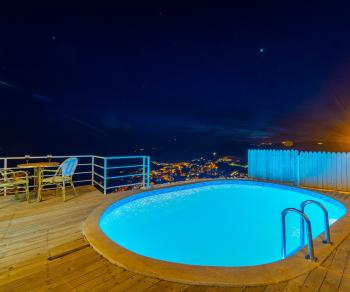 Havuz ebatlarımız 5 metre x 3 metre olup derinlik 1,50 metredir. Havuz terasında 4 kişilik masa, 2 adet şezlong, şemsiye, duş ve taştan barbeküsü ve havuz terasında ayrı bir jakuzi mevcuttur. Villa içinde küçük bir Amerikan mutfak-bar, ofis tipi buzdolabı, bulaşık makinası, ocak ve çamaşır makinası yer almaktadır. Oturma odası; bir köşe kanepe, sehpa ve LCD Tv’den oluşmaktadır. İnternet bağlantısı ortak olarak sağlanacaktır. Yatak odalarında çift kişilik yatak, 2 komidin, elbise dolabı, makyaj masası ve jakuzi bulunmaktadır.