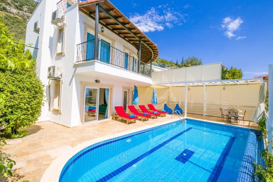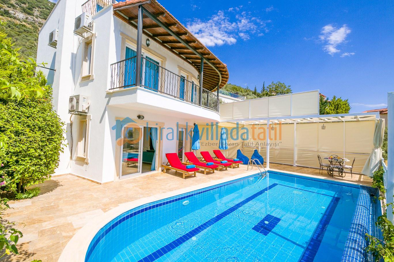 Bu ilan ait Detaylı açıklama ve bilinmesi gereken detaylarKızıltaş mevkiinde, Kalkan Koyu’na hâkim manzaraya sahip konumda yer alan bu kiralık villa, deniz manzarası ve mahremiyet odaklı yapısıyla sakin ve konforlu bir villa kiralama deneyimi sunar. Üç süit yatak odasıyla 6 kişilik kapasiteye sahip olan villa, aileler ve arkadaş grupları için uygundur. Her yatak odasının özel banyosu ve balkonu bulunması, konaklama boyunca rahat ve bağımsız bir kullanım sağlar.