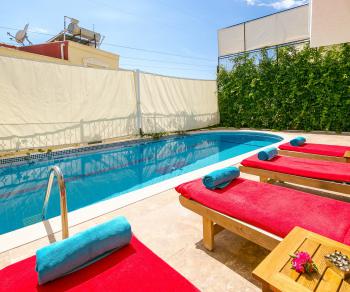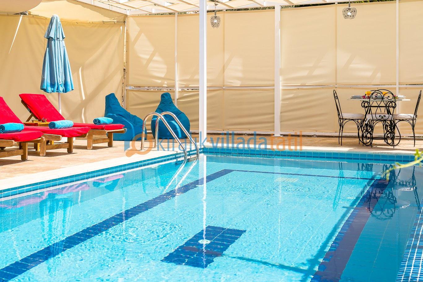 Havuz ve bahçe alanı, dışarıdan görünmeyecek şekilde planlanmış olup korunaklı villa anlayışına uygundur. Bu yapı, mahremiyete önem veren misafirler için güvenli ve rahat bir kullanım sunar. Güneşlenme alanları, oturma grubu ve mangal köşesiyle gün boyu keyifli vakit geçirilebilecek bir dış yaşam alanı oluşturulmuştur. Bu özellikleriyle villa, muhafazakâr villa arayışında olan misafirler tarafından da tercih edilmektedir.