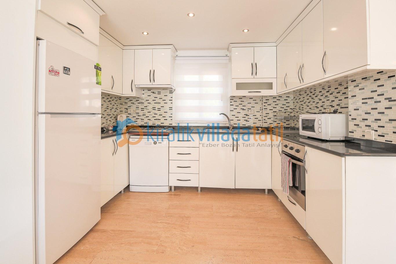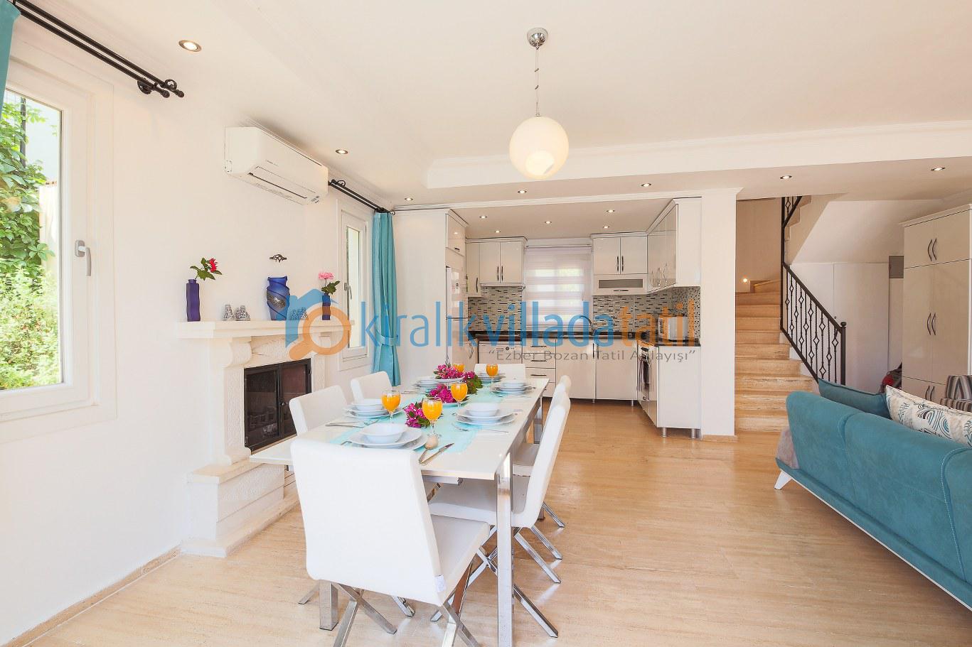 İç mekân modern ve ferah bir anlayışla düzenlenmiştir. Geniş oturma alanı ve tam donanımlı mutfak, uzun süreli konaklamalar için kullanışlıdır. Klima, internet bağlantısı, ütü, saç kurutma makinesi ve günlük yaşamda ihtiyaç duyulabilecek tüm temel ekipmanlar villada eksiksiz şekilde yer alır.