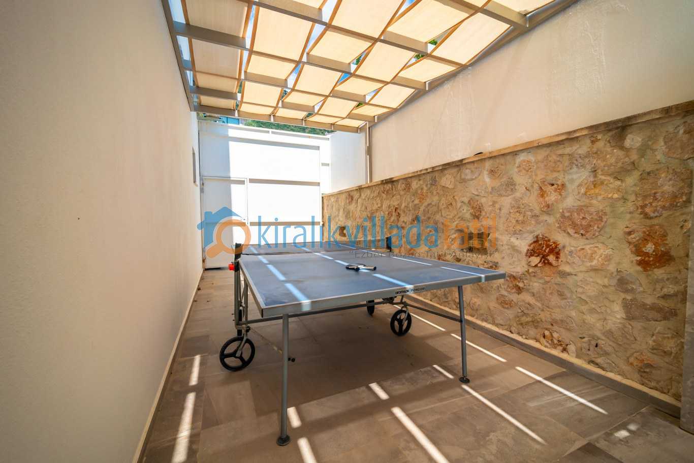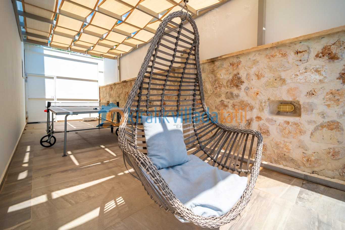 Villanın havuz terası özel demir pergola sistemi ile dışarıdan görünmeyecek şekilde düzenlenmiştir. bu yapı sayesinde korunaklı villa ve muhafazakar villa konseptine uygun güvenli ve özel bir kullanım alanı sağlanır. havuz alanının izole yapısı özellikle mahremiyete önem veren aileler için tatili daha rahat ve özgür hale getirir.