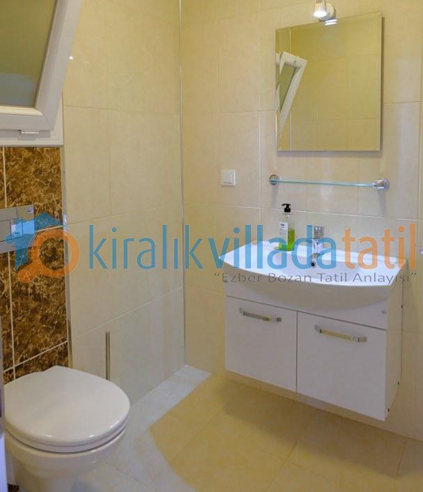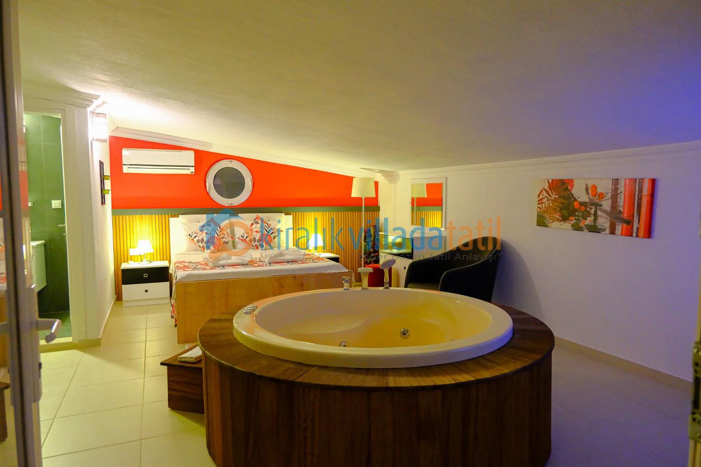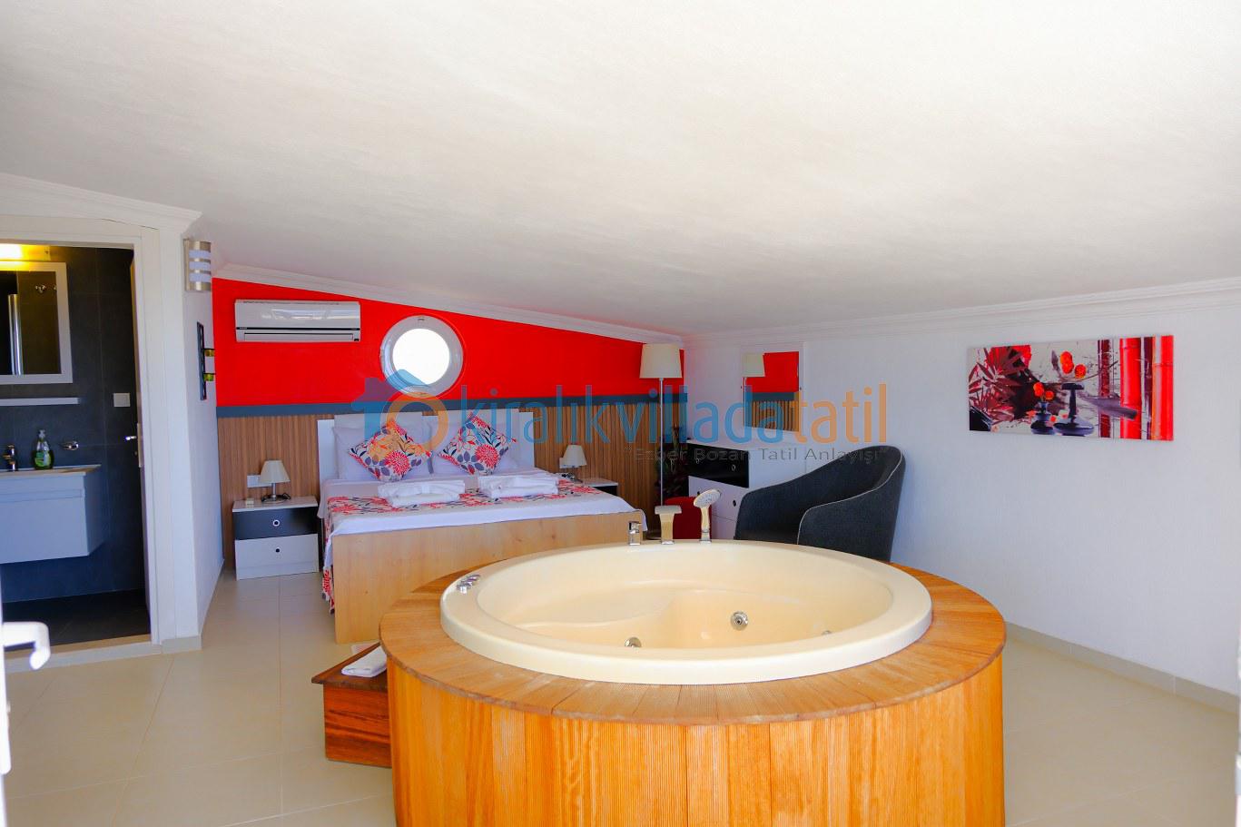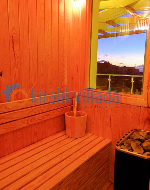 Villanın tüm yatak odalarında banyo wc olarak planlanmış olup, ana yatak odasında jakuzi bulunmaktadır. Günün yorgunluğunu atabileceğiniz özel sauna alanı sayesinde tatilinizi spa konforunda geçirebilirsiniz. Deniz manzaralı geniş havuz terasında yer alan dış yüzme havuzu ısıtmalı olup sezon dışı konaklamalarda da keyifli kullanım sağlar.