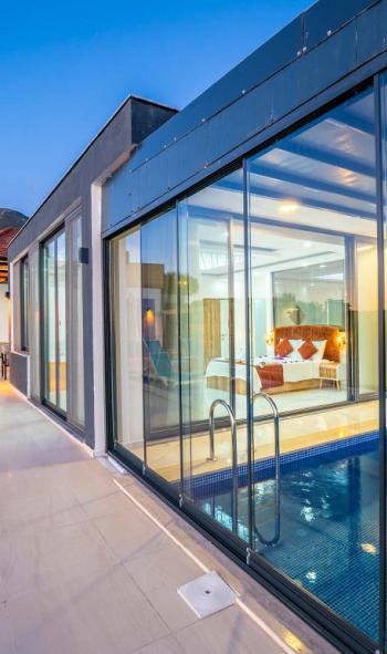 Modern ve rahat bir iç tasarımı bulunan villamız, misafirlerimizin konforlu bir tatil geçirebilmesi için özenle tasarlanmıştır. Isıtmalı iç havuz yer alan villamızda Muhafazakar ailelerimiz ve balayı çiftelerimiz içinde iadeal olan bir villamızdır.