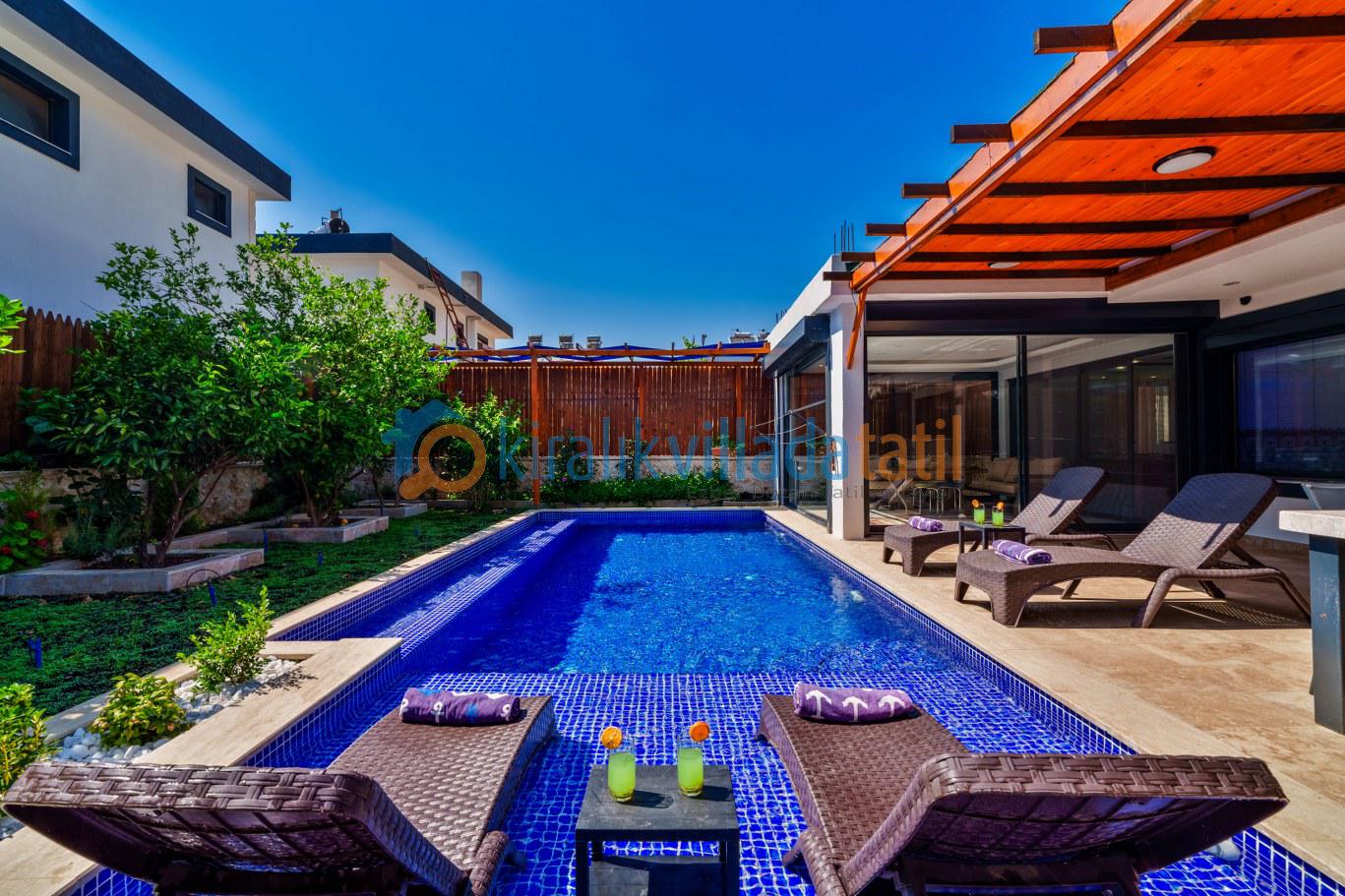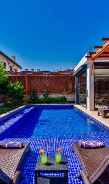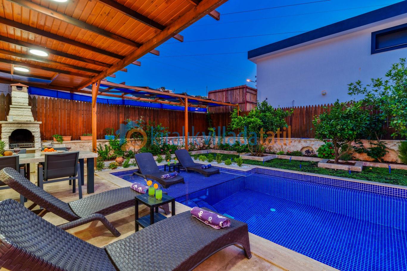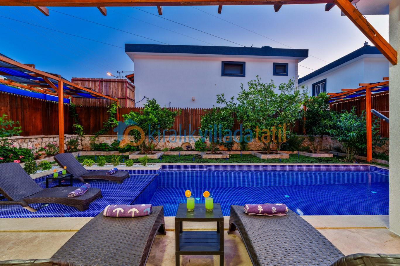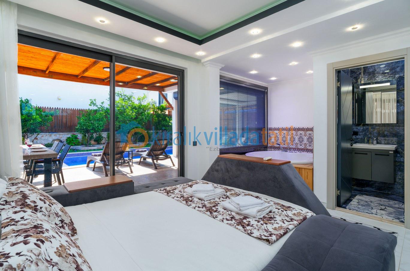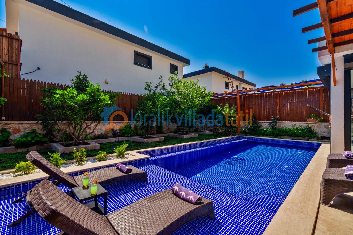 Villanın özel yüzme havuzu ve havuz terası korunaklı olarak planlanmış olup, dış gözlerden uzak yapısı sayesinde muhafazakar aileler ve balayı çiftleri için uygun bir konaklama seçeneği oluşturur. Geniş havuz terası, gün boyu rahatça vakit geçirebileceğiniz ferah bir kullanım alanı sunmaktadır.