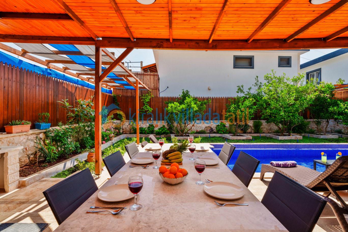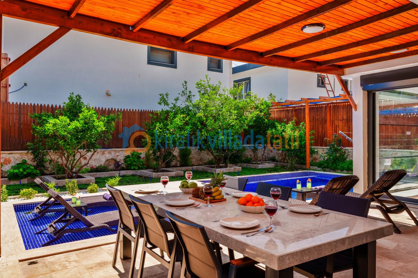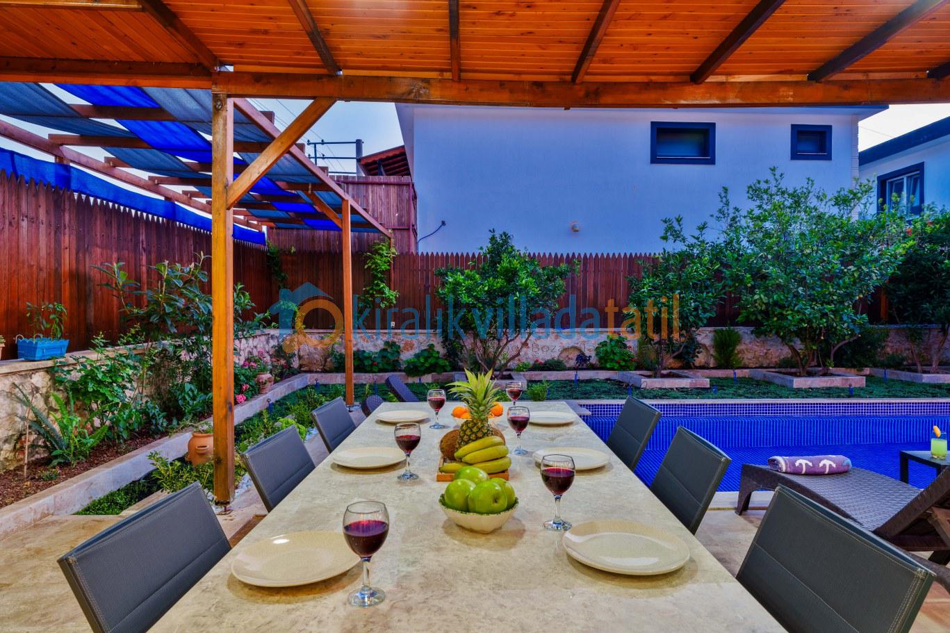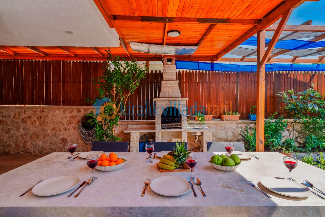 Havuz terasında yer alan yemek masası, akşam yemeklerini açık havada keyifle geçirmek isteyen misafirler için ideal bir ortam sunarken; barbekü alanı da tatilinize keyifli anlar katmaktadır.