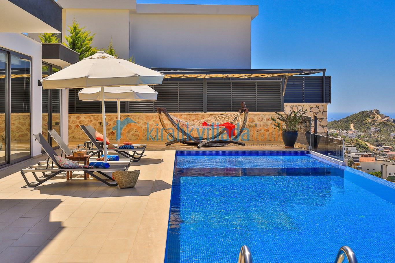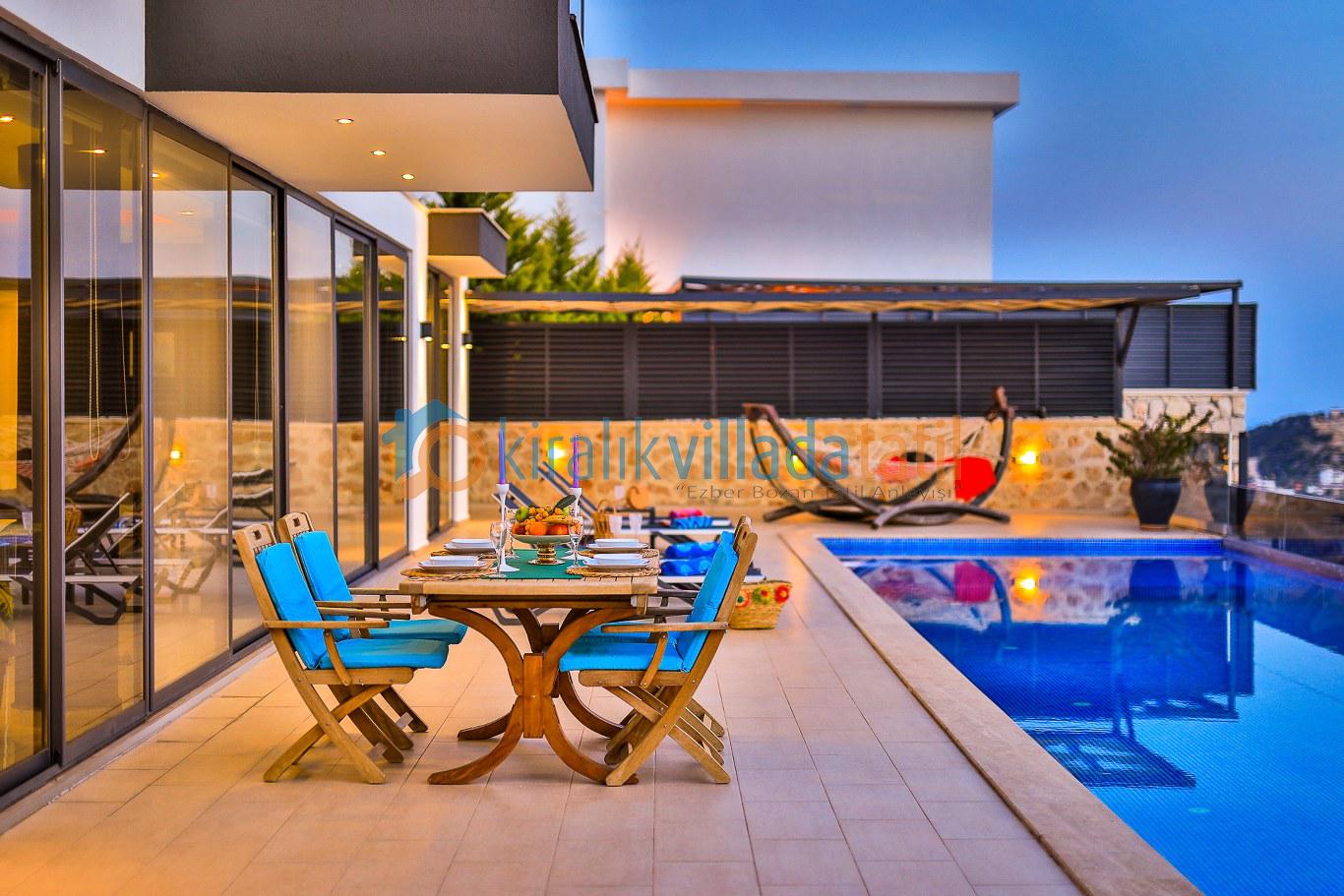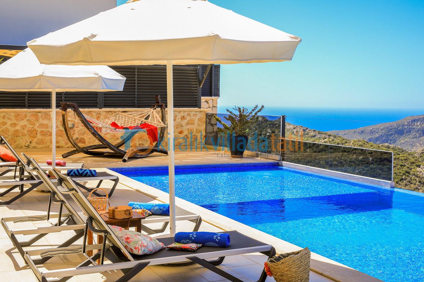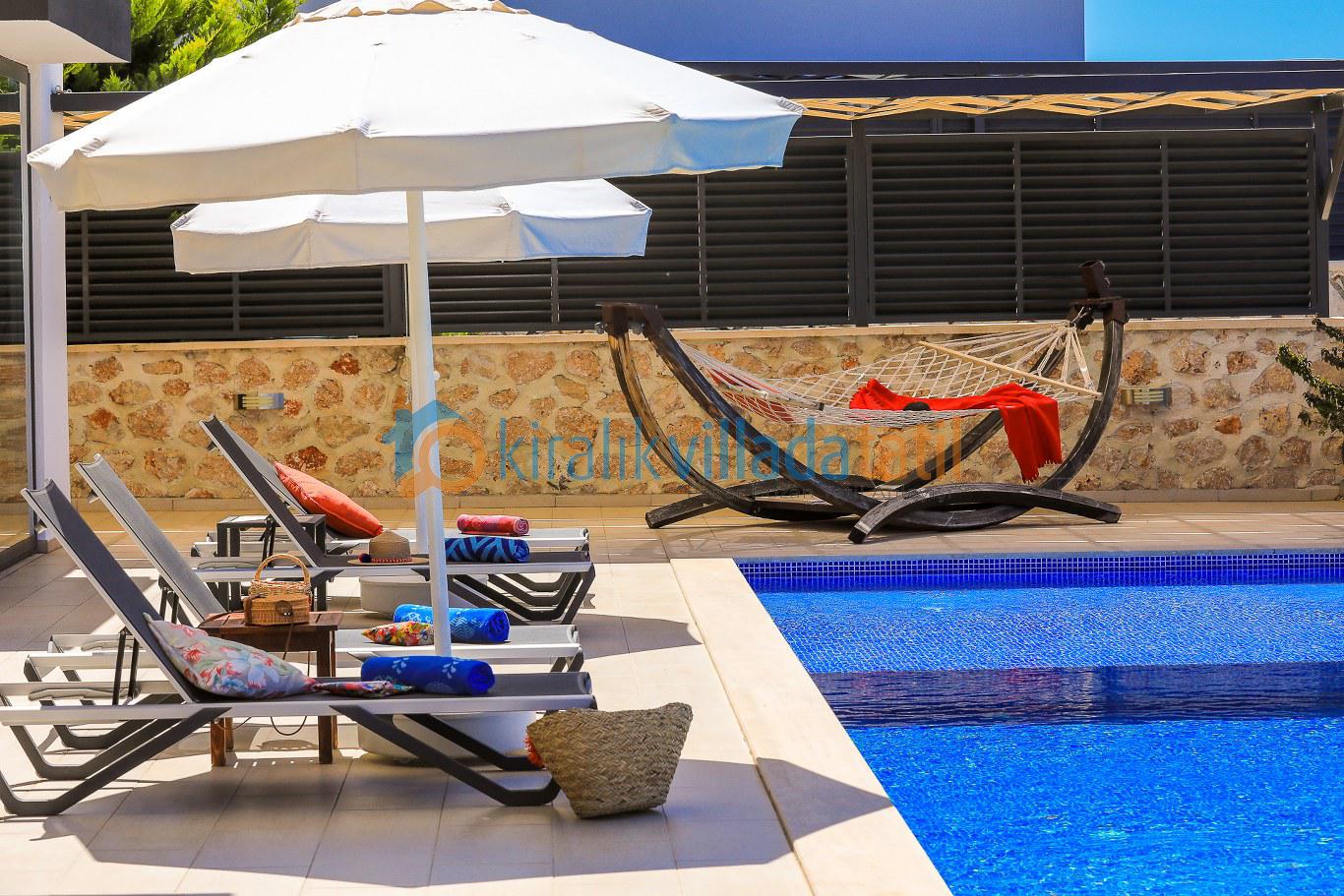 11 metre uzunluğunda, 4 metre genişliğinde yüzme havuzu ve 4 metrelik sığ havuz alanı ile villamız hem çocuklu aileler hem de balayı çiftleri için idealdir. Havuz terasında, Akdeniz manzarasına karşı kahvaltınızı yapabilir veya akşam yemeğinde gün batımını izleyebilirsiniz.