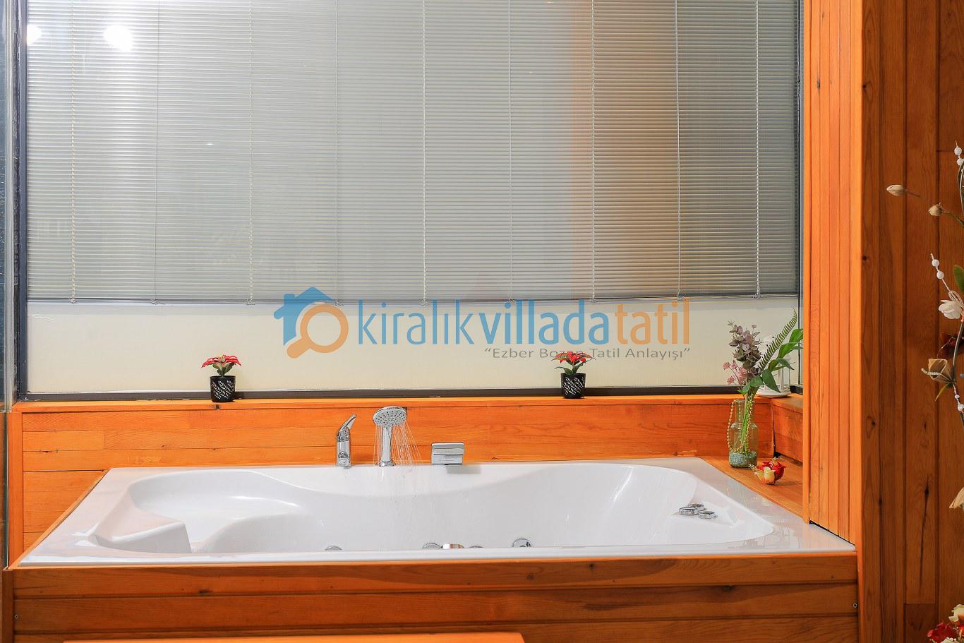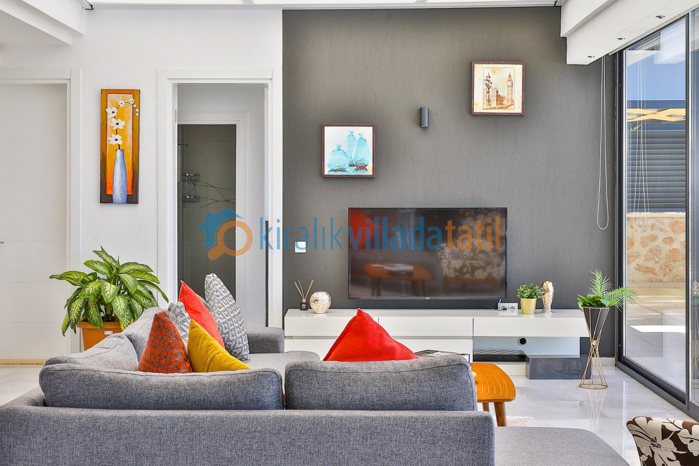 Villamız, 2 adet banyolu süit yatak odasına sahip olup toplamda 4 kişilik konaklama kapasitesine sahiptir. Geniş ve ferah mimarisiyle öne çıkan villanın yaşam alanında uzaktan kumandalı, açılır-kapanır tavan perdesi bulunur. Akşamları bu perdeyi açarak yıldızların altında keyifli anlar yaşayabilirsiniz.