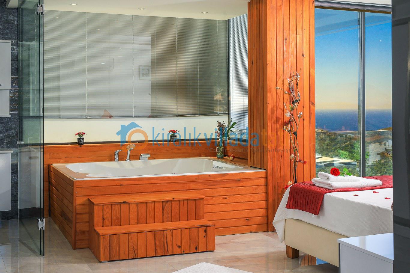 Üst katta yer alan ebeveyn süitinde geniş ebatlı jakuzisi, manzaralı balkonu ve cam cepheli mimarisiyle tamamen özel bir alan sizi bekliyor. Sabah uyandığınızda doğrudan deniz manzarasına karşı güne başlamak bu villanın en özel ayrıcalıklarından biri.