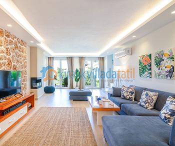 Villamız özenle dekore edilmiştir ve teras alanından Kalkan manzarasına sahiptir. Salondaki yerden tavana kadar olan camları evin içerisinin ışıkla dolmasını sağlar.