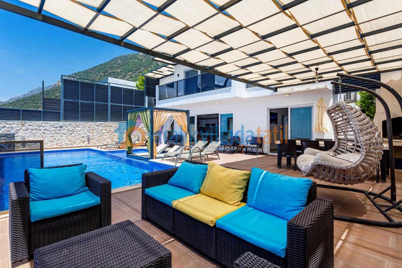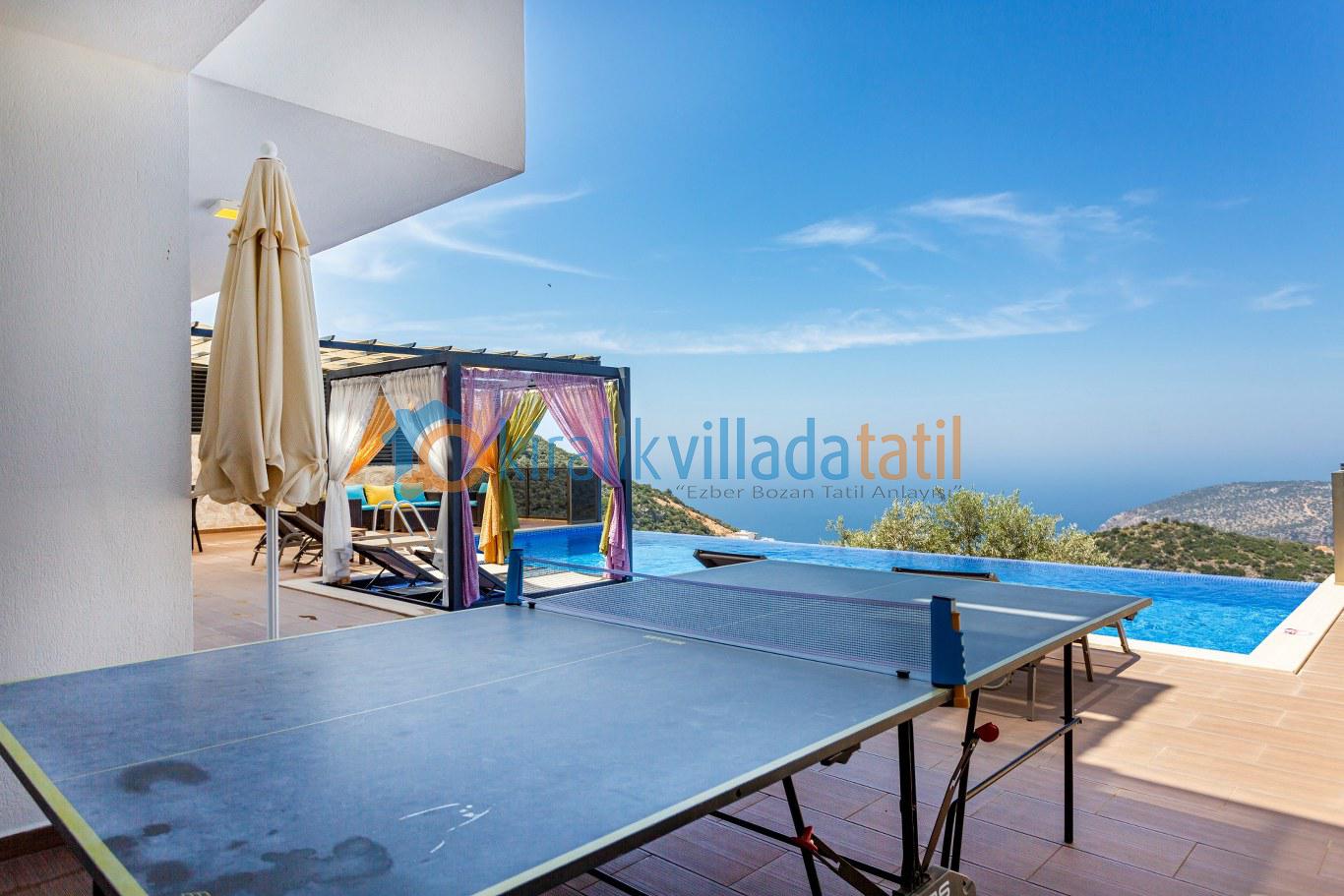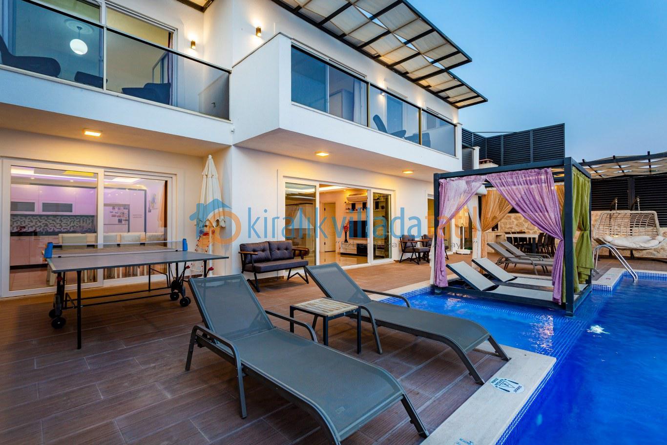 Teras alanında 8 kişilik yemek masası ve sandalyeler, özel yüzme havuzu, 6 adet şezlong, oturma grubu, masa tenisi, güneş şemsiyesi ve barbekü bulunmaktadır.