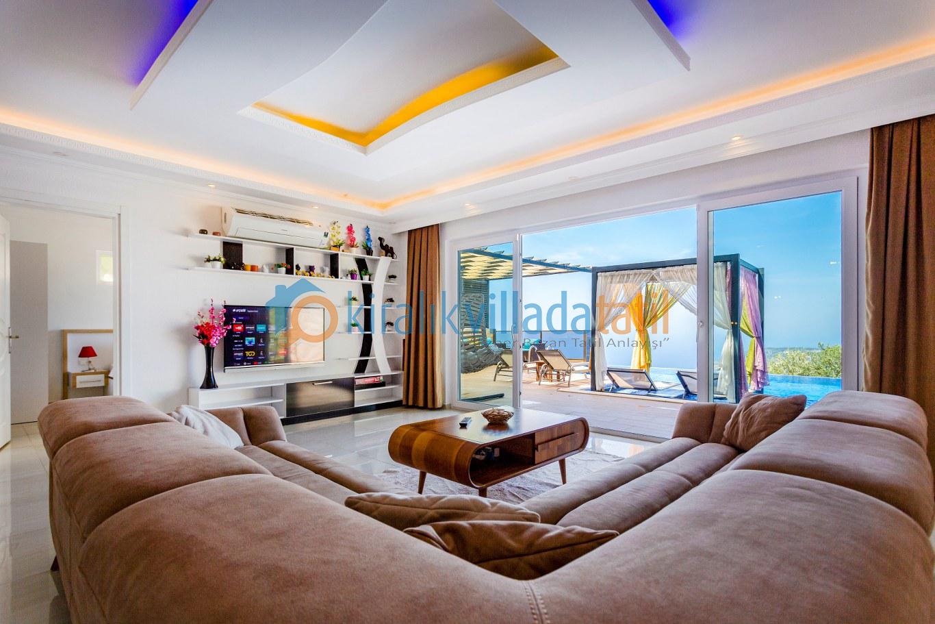 Zemin katta bulunan salon, deniz ve doğa manzarasına açılan ferah yapısıyla dikkat çeker.