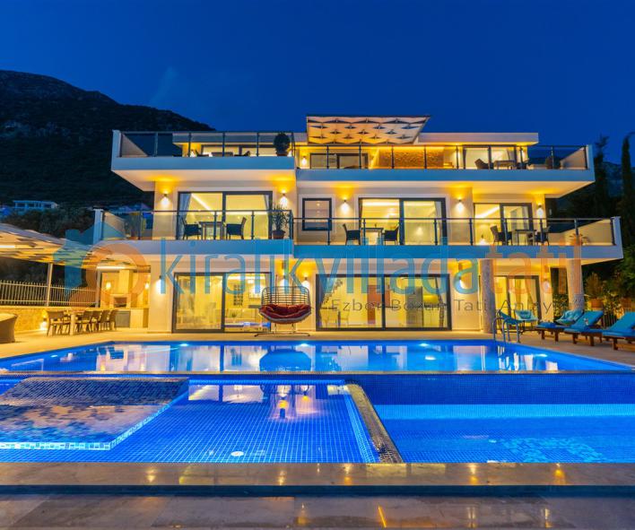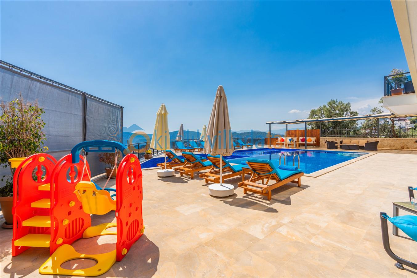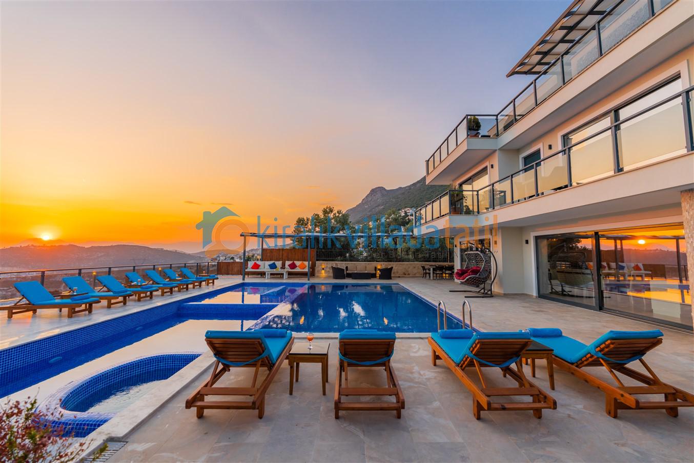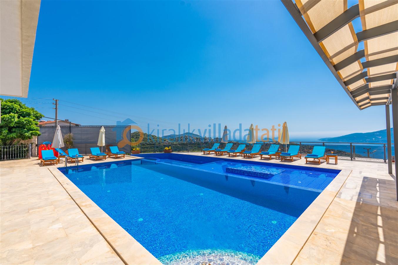 Geniş yüzme havuzu, büyük teras alanı ve büyüleyici deniz manzarası, bu villayı Kalkan’ın en seçkin tatil seçeneklerinden biri haline getirir. Çocuk havuzunda yer alan hidromasaj bölümü, hem çocuklar hem de yetişkinler için keyifli bir kullanım sağlar. Çatı katındaki özel jakuzi ise günbatımına karşı benzersiz bir manzara deneyimi sunar.