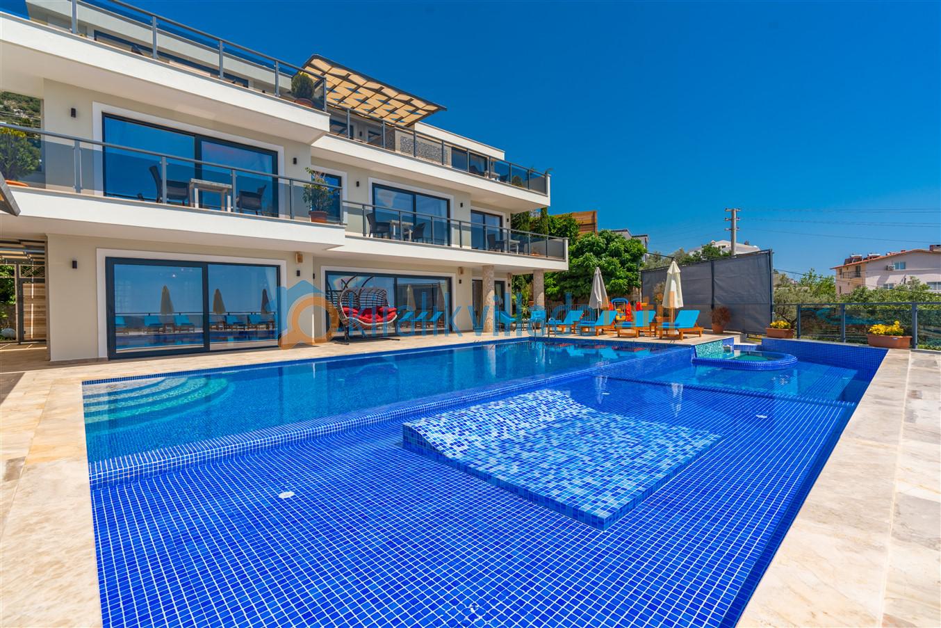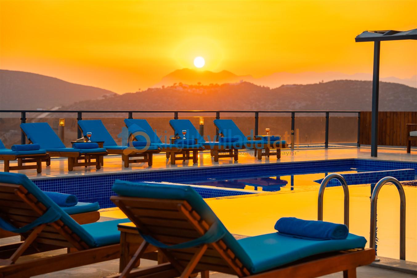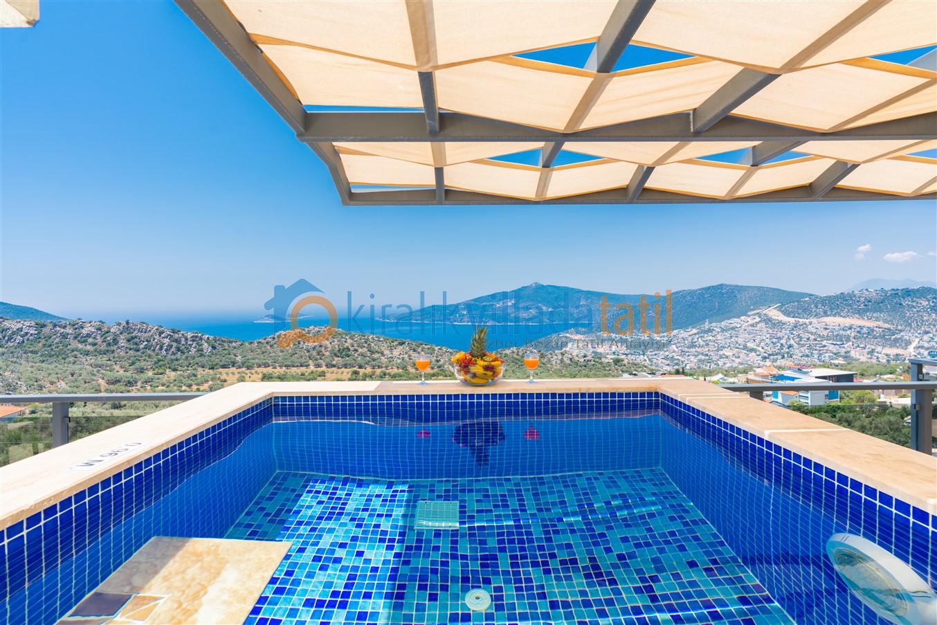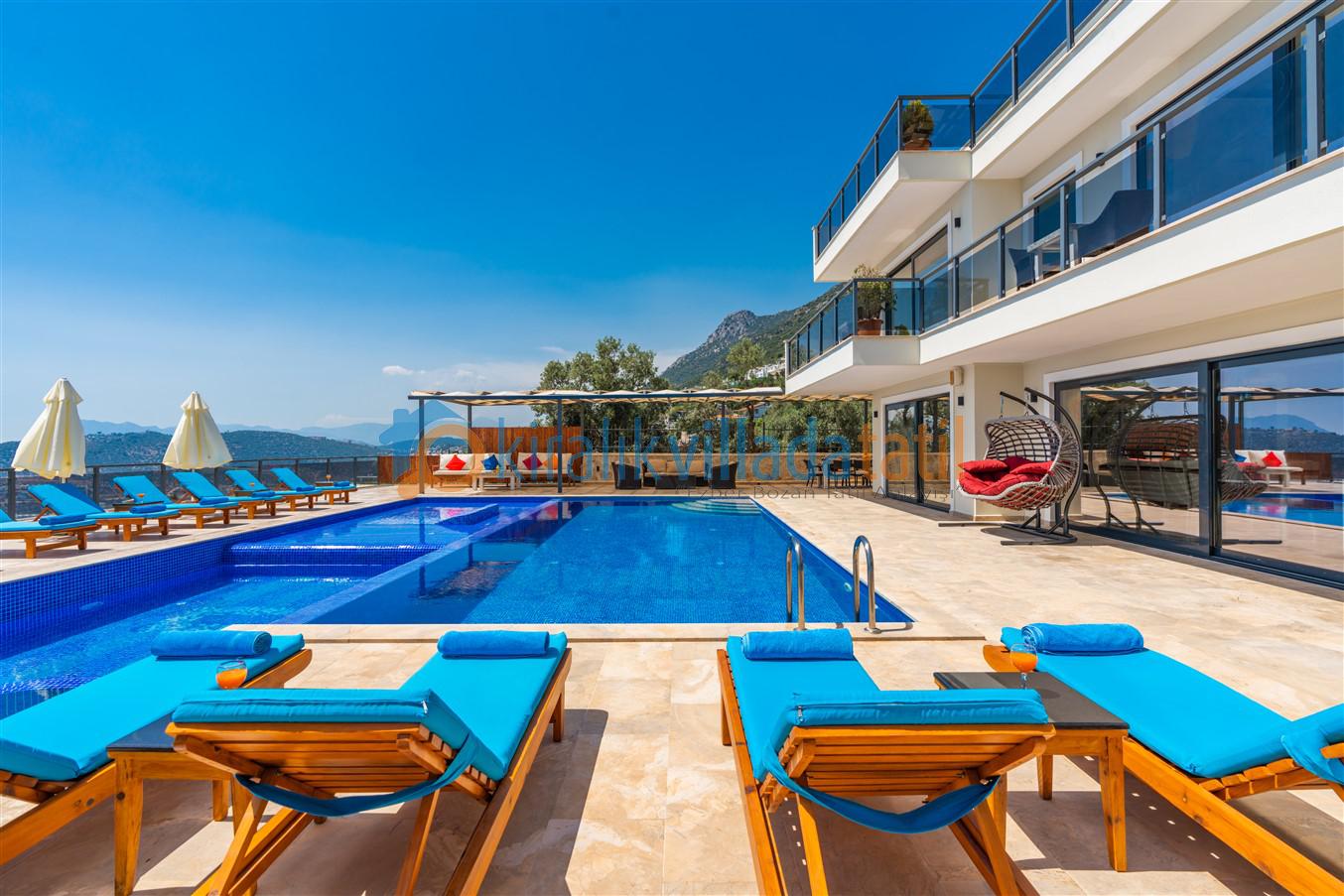 Geniş yüzme havuzu, büyük teras alanı ve büyüleyici deniz manzarası, bu villayı Kalkan’ın en seçkin tatil seçeneklerinden biri haline getirir. Çocuk havuzunda yer alan hidromasaj bölümü, hem çocuklar hem de yetişkinler için keyifli bir kullanım sağlar. Çatı katındaki özel jakuzi ise günbatımına karşı benzersiz bir manzara deneyimi sunar.