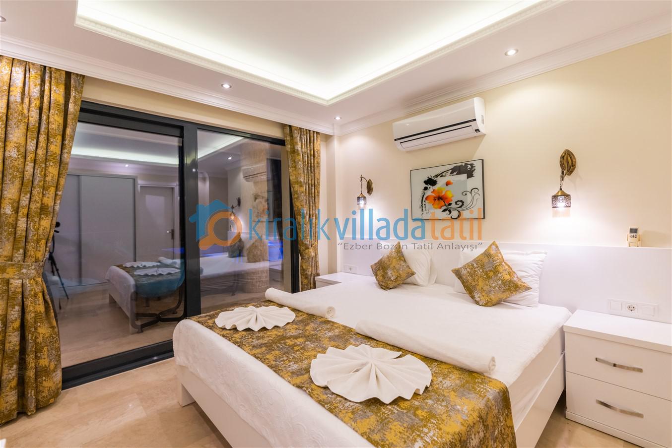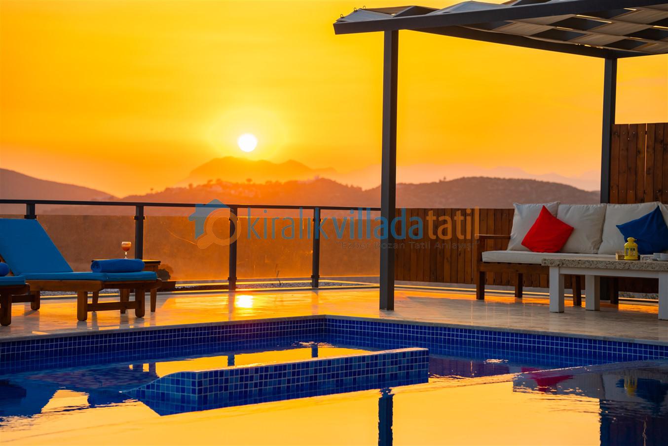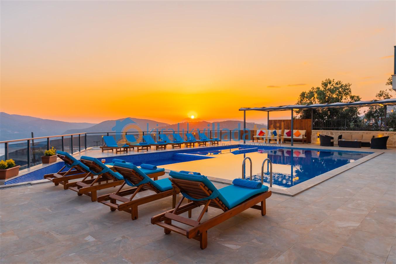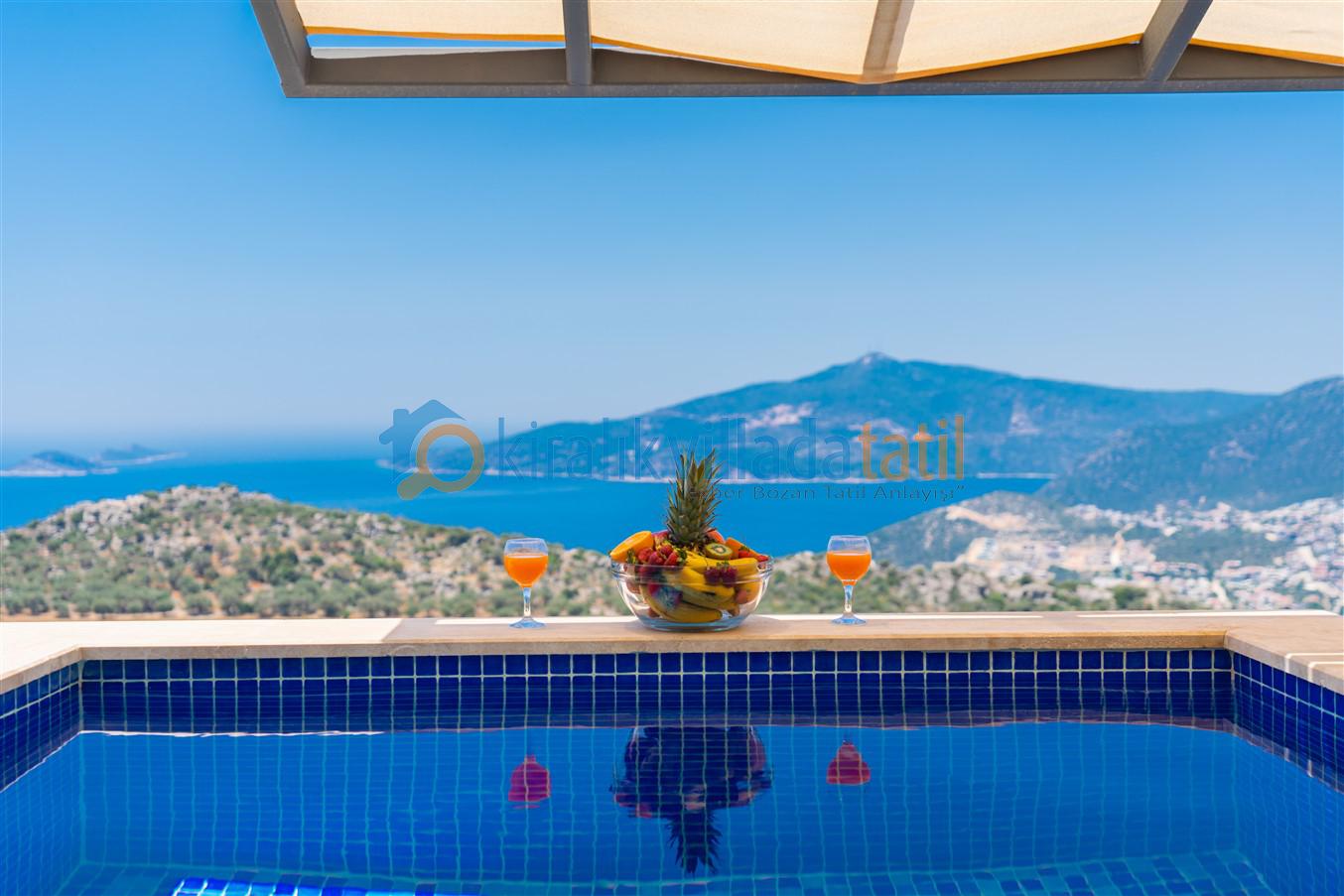 Geniş yüzme havuzu, büyük teras alanı ve büyüleyici deniz manzarası, bu villayı Kalkan’ın en seçkin tatil seçeneklerinden biri haline getirir. Çocuk havuzunda yer alan hidromasaj bölümü, hem çocuklar hem de yetişkinler için keyifli bir kullanım sağlar. Çatı katındaki özel jakuzi ise günbatımına karşı benzersiz bir manzara deneyimi sunar.