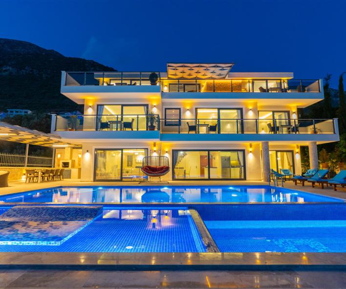 Kalkan’ın Kördere mevkiinde konumlanan bu özel tasarım lüks villa, altı adet banyolu süit yatak odasıyla 12 kişilik konaklama kapasitesi sunar. Büyük aileler, kalabalık arkadaş grupları ve konforlu bir tatil arayan misafirler için ideal olan villa; geniş kullanım alanları, şık dekorasyonu ve yüksek mahremiyet seviyesine sahip yapısıyla öne çıkar.