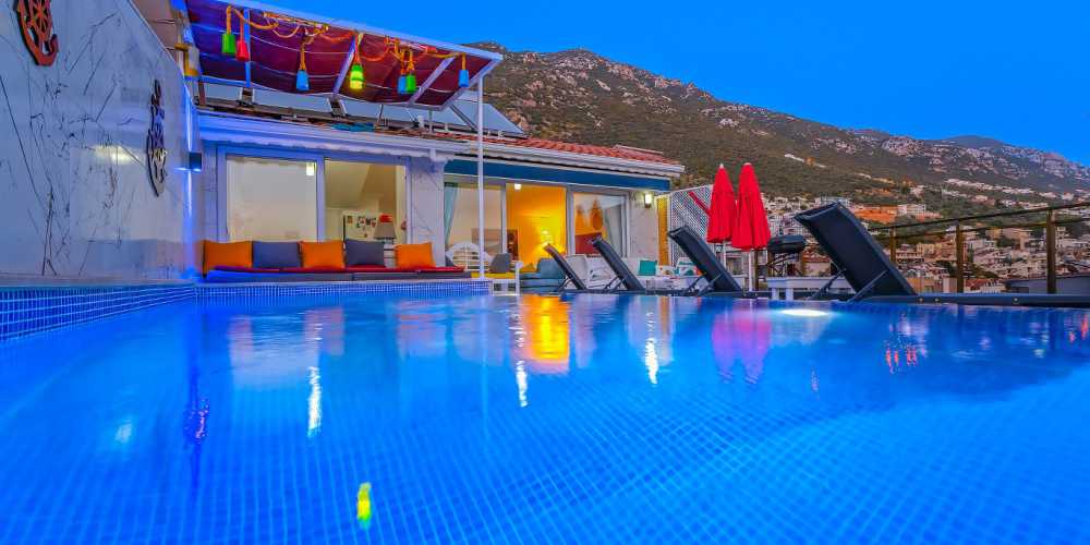 Villanın özel yüzme havuzu, Kalkan’ın masmavi koylarına bakan panoramik bir manzaraya sahiptir. Gün boyu güneş alan havuz terası; şezlong takımı, oturma alanı ve barbekü köşesiyle keyifli vakit geçirmeye uygundur.