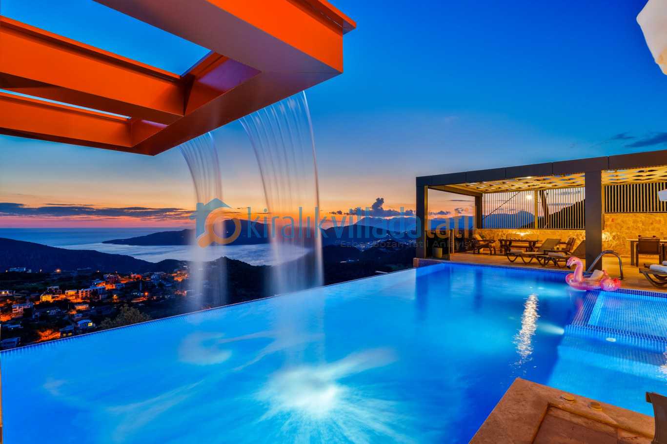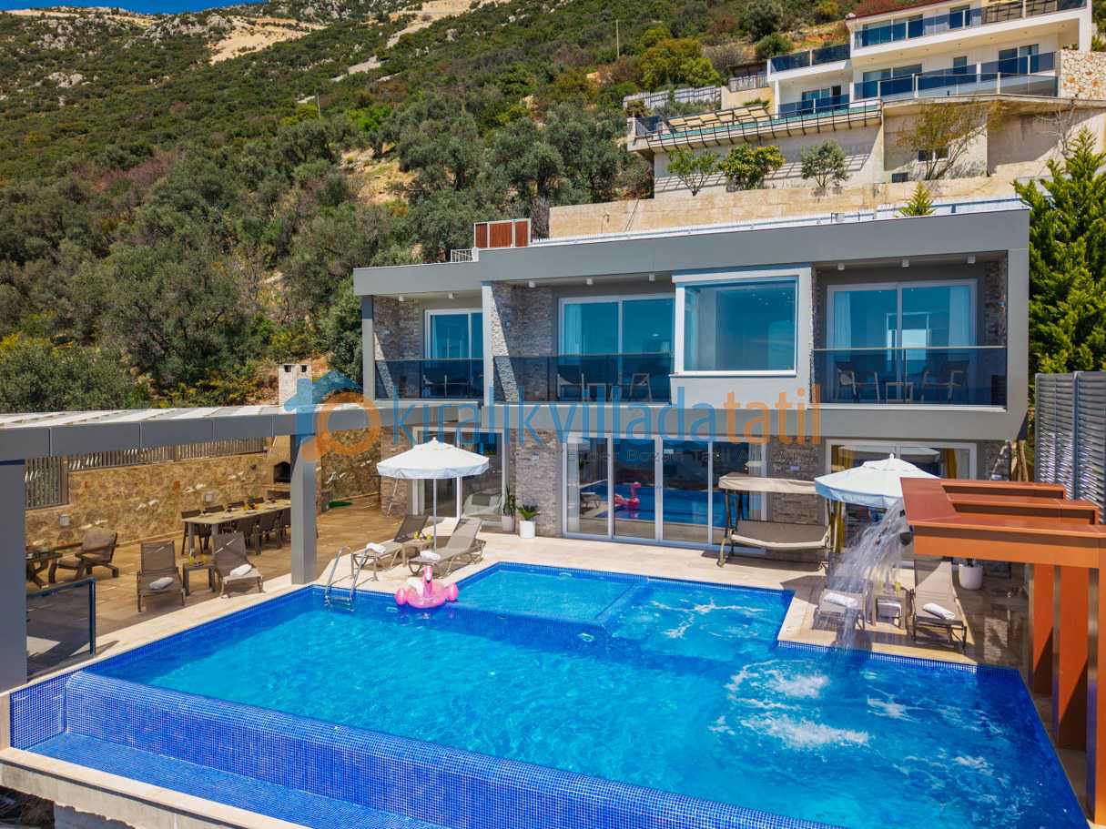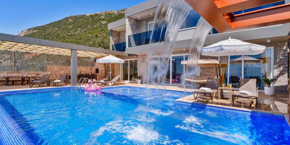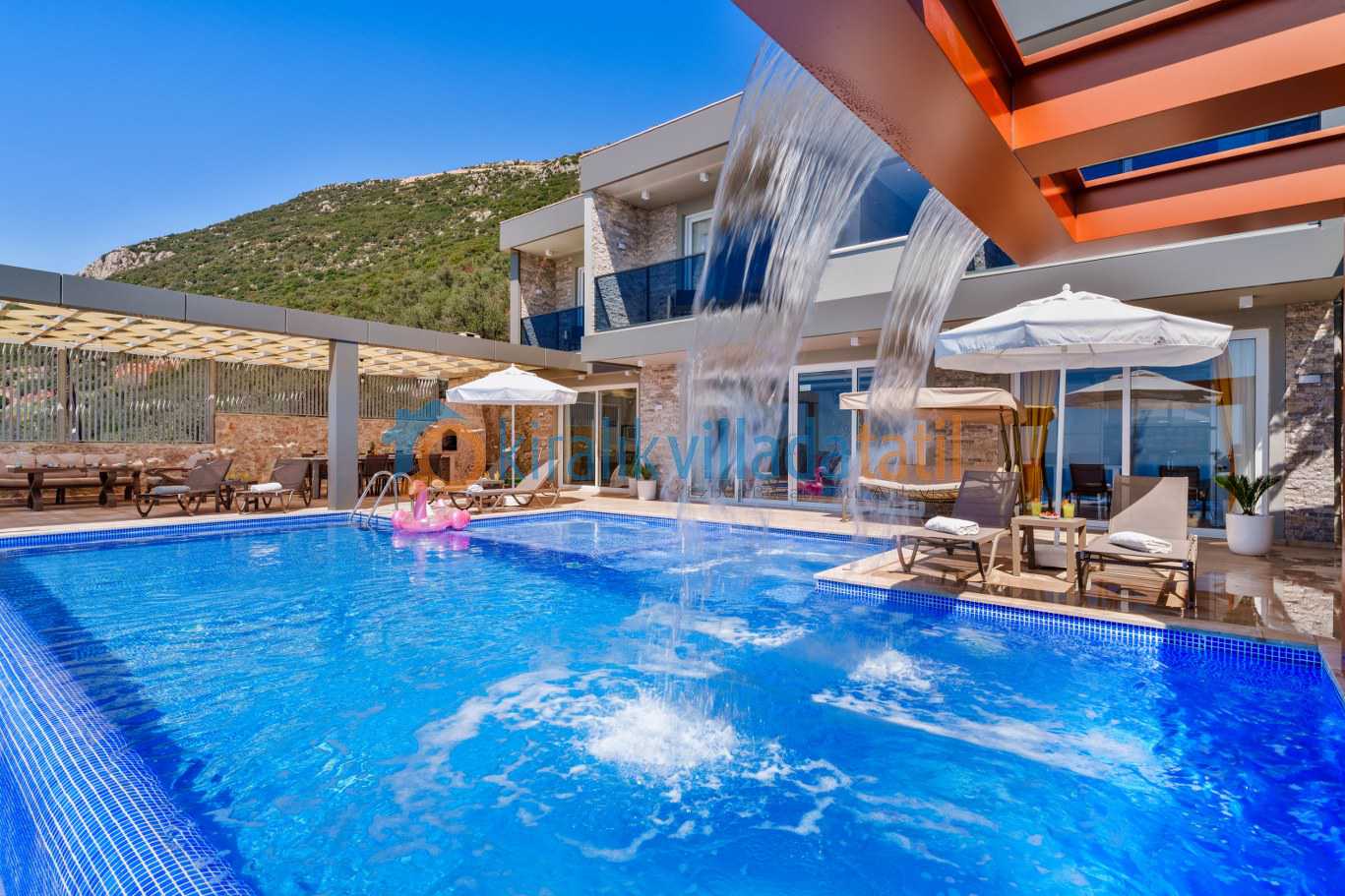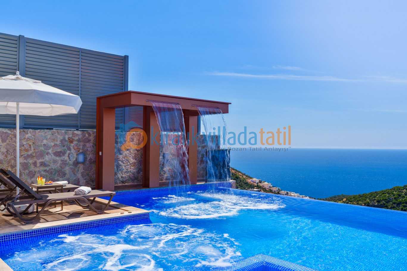 Dış alanda bulunan özel yüzme havuzu geniş havuz terası ve modern yapay şelale detayı bu yeri daha da özel kılar. Gün boyu güneşlenmek manzara eşliğinde dinlenmek ve sevdiklerinizle keyifli zaman geçirmek için oldukça elverişli bir alan sunar. Korunaklı yapısı sayesinde daha gözlerden uzak bir kullanım isteyen misafirler için de rahat bir tatil ortamı sağlar. Özellikle mahremiyete önem verenler için korunaklı villa konseptine yakın bir konfor sunması önemli bir avantajdır.