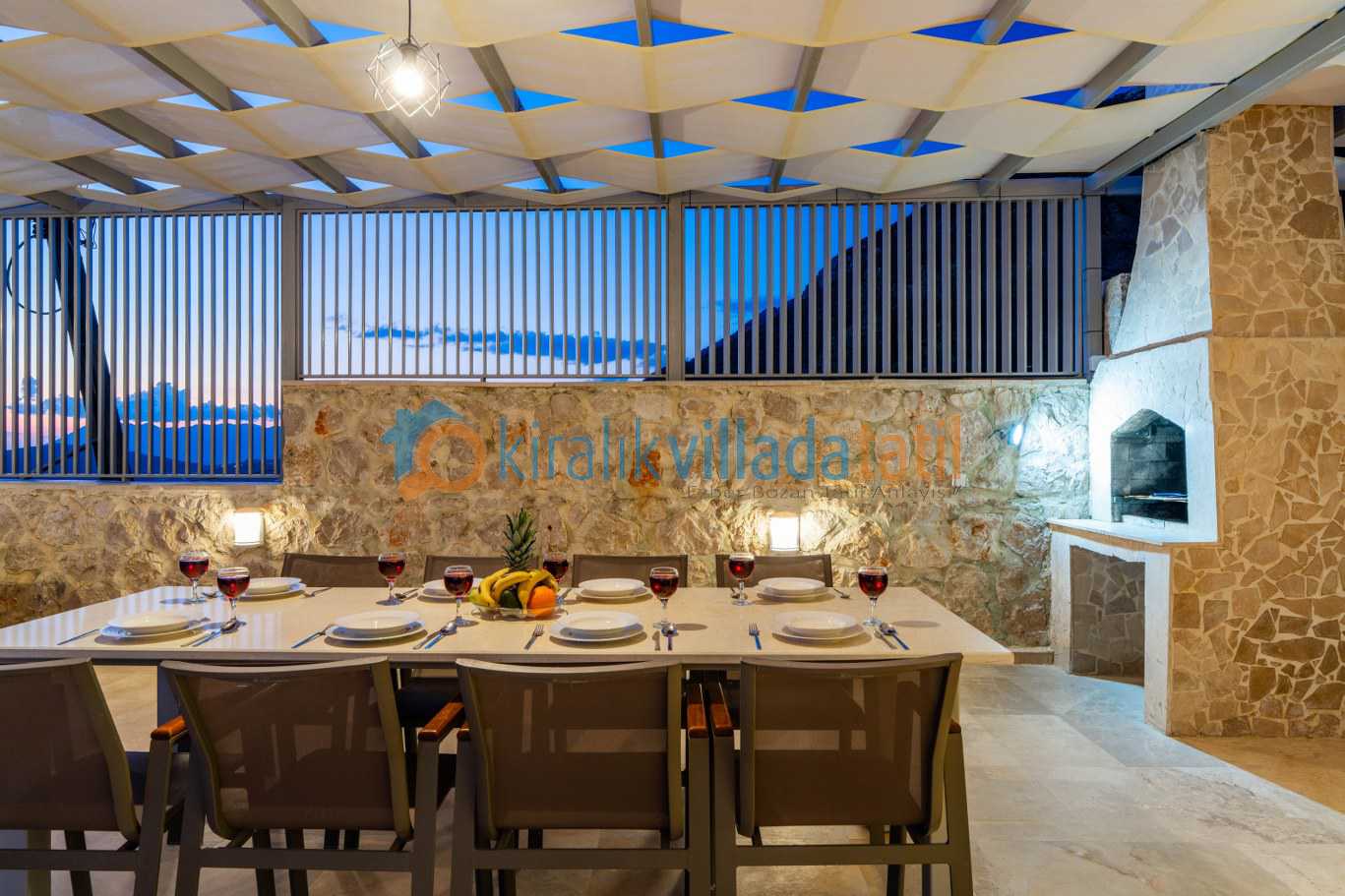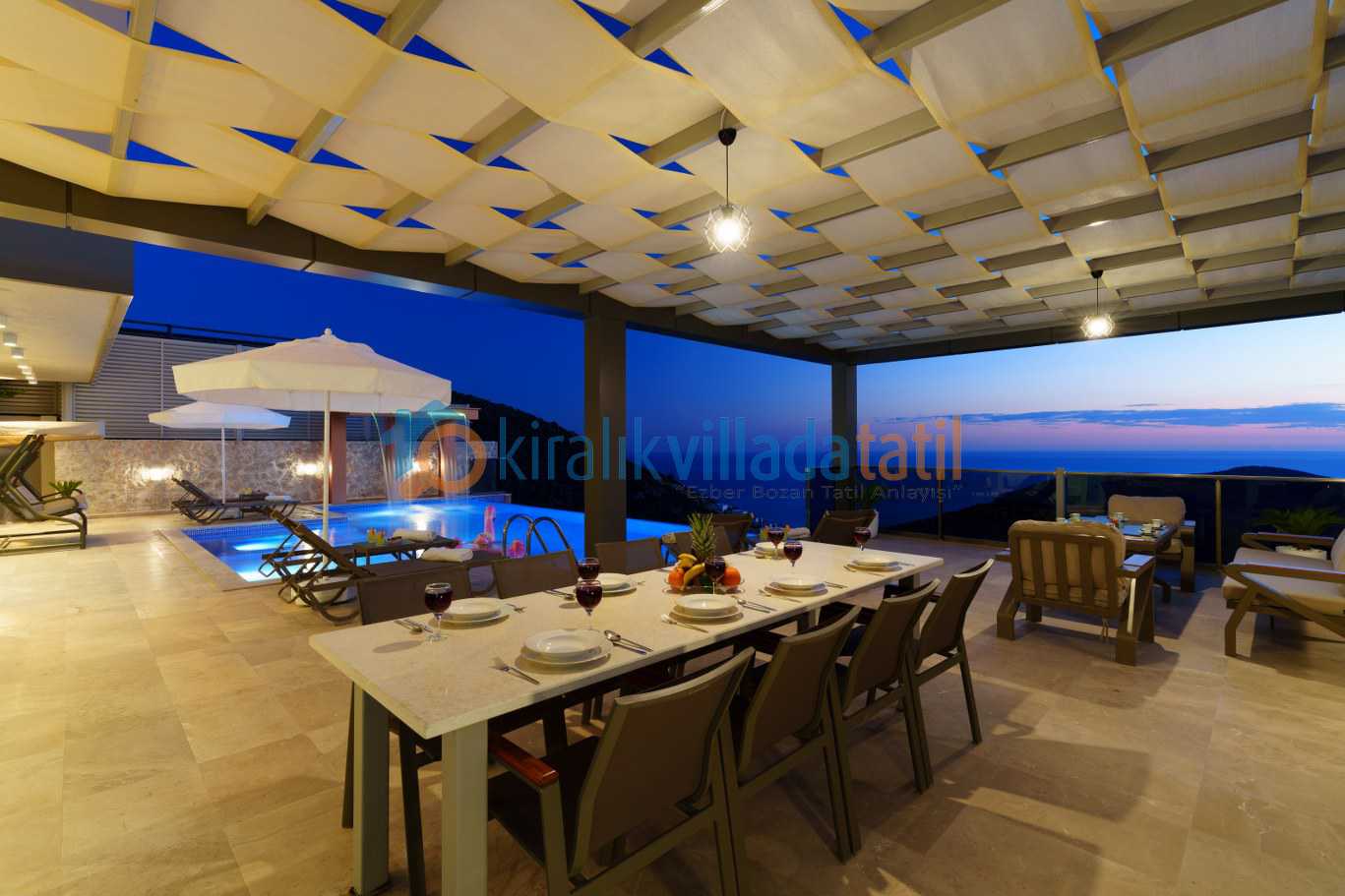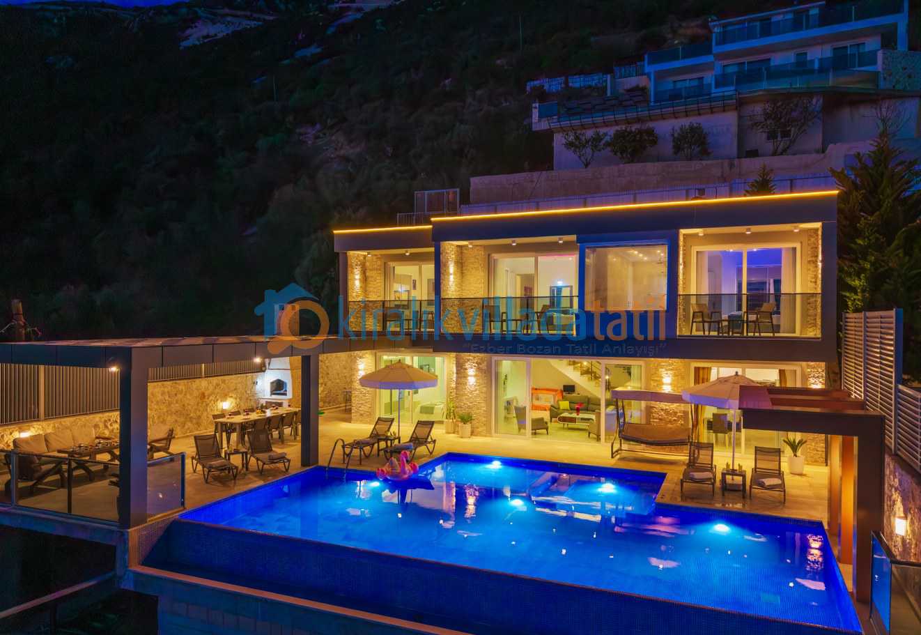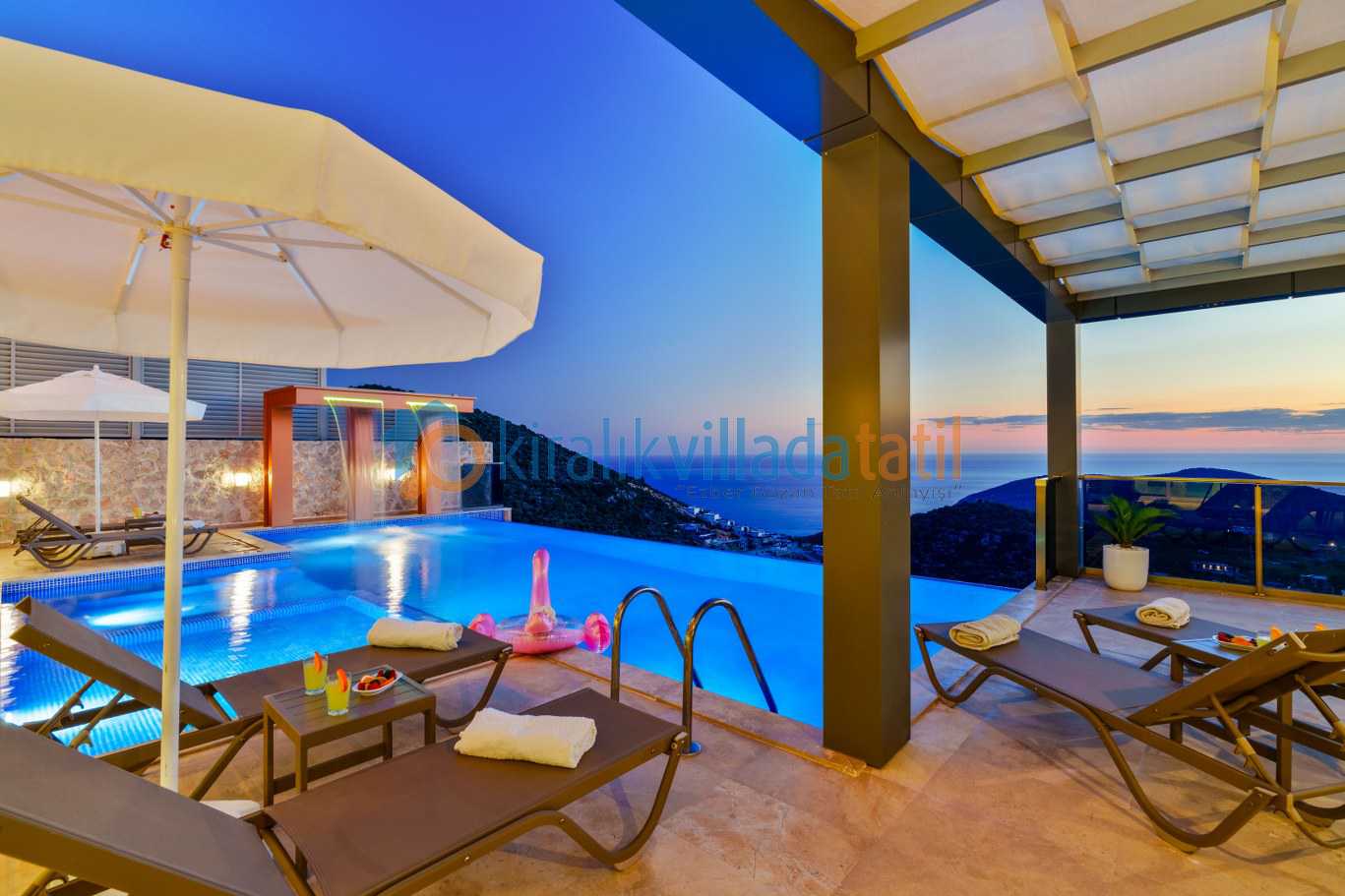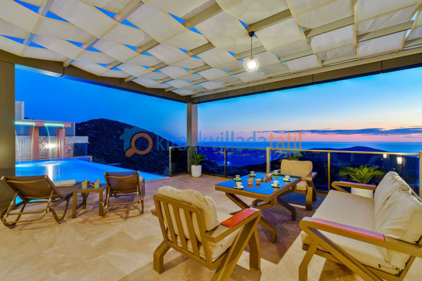 Deniz manzarası ile birleşen geniş teras alanı akşam saatlerinde çok daha etkileyici bir atmosfere dönüşür. Gün batımını izlemek açık havada vakit geçirmek ve sakin bir akşam geçirmek isteyenler için oldukça keyifli bir alan oluşturur. Hem merkezi konumda olup hem de bu kadar özel bir manzara sunması bu lüks villa seçeneğini daha değerli hale getirir. Kalkan’ın canlı yapısına yakın olmak isteyen ama aynı zamanda daha özel bir tatil geçirmek isteyen misafirler için dengeli bir alternatif sunar.