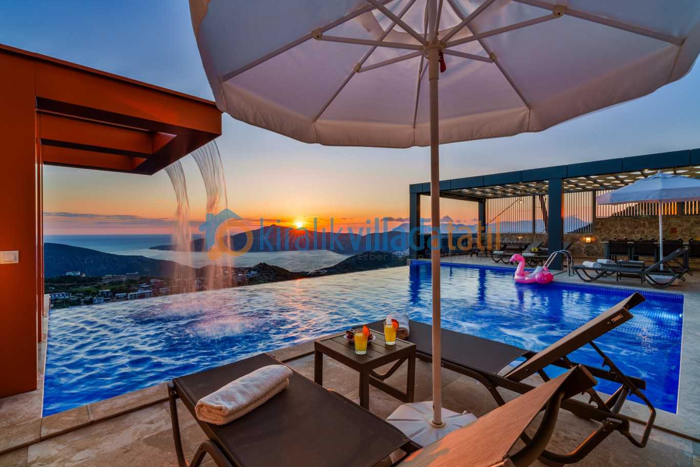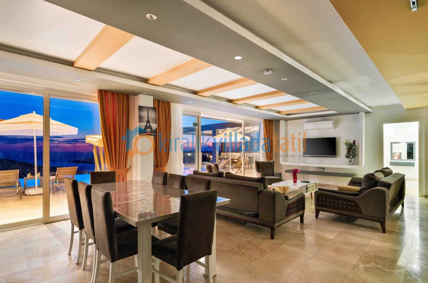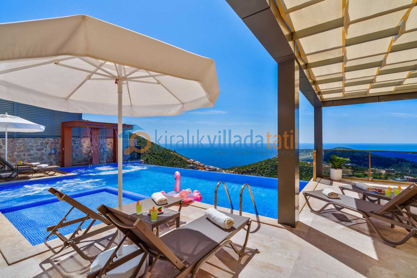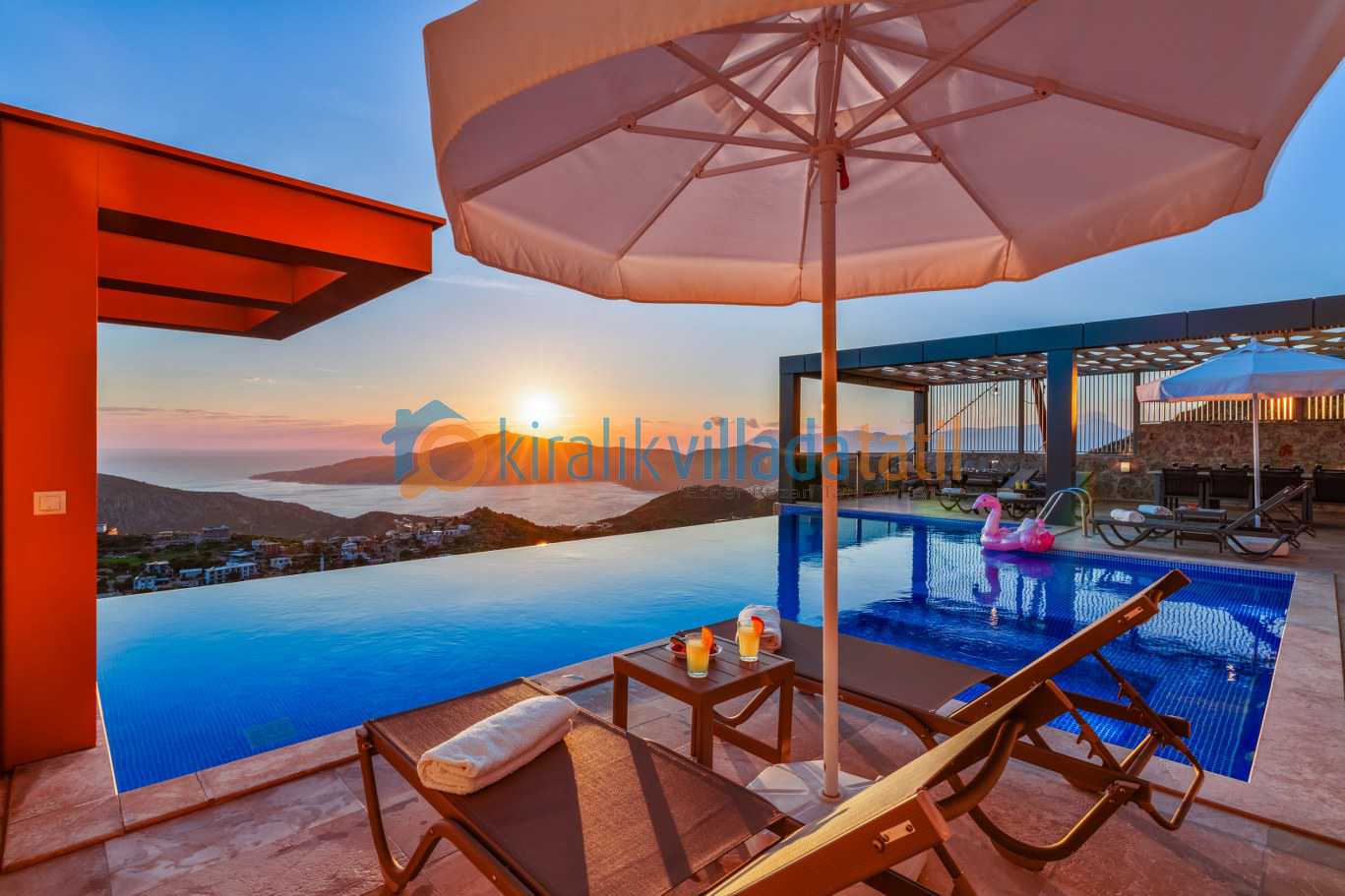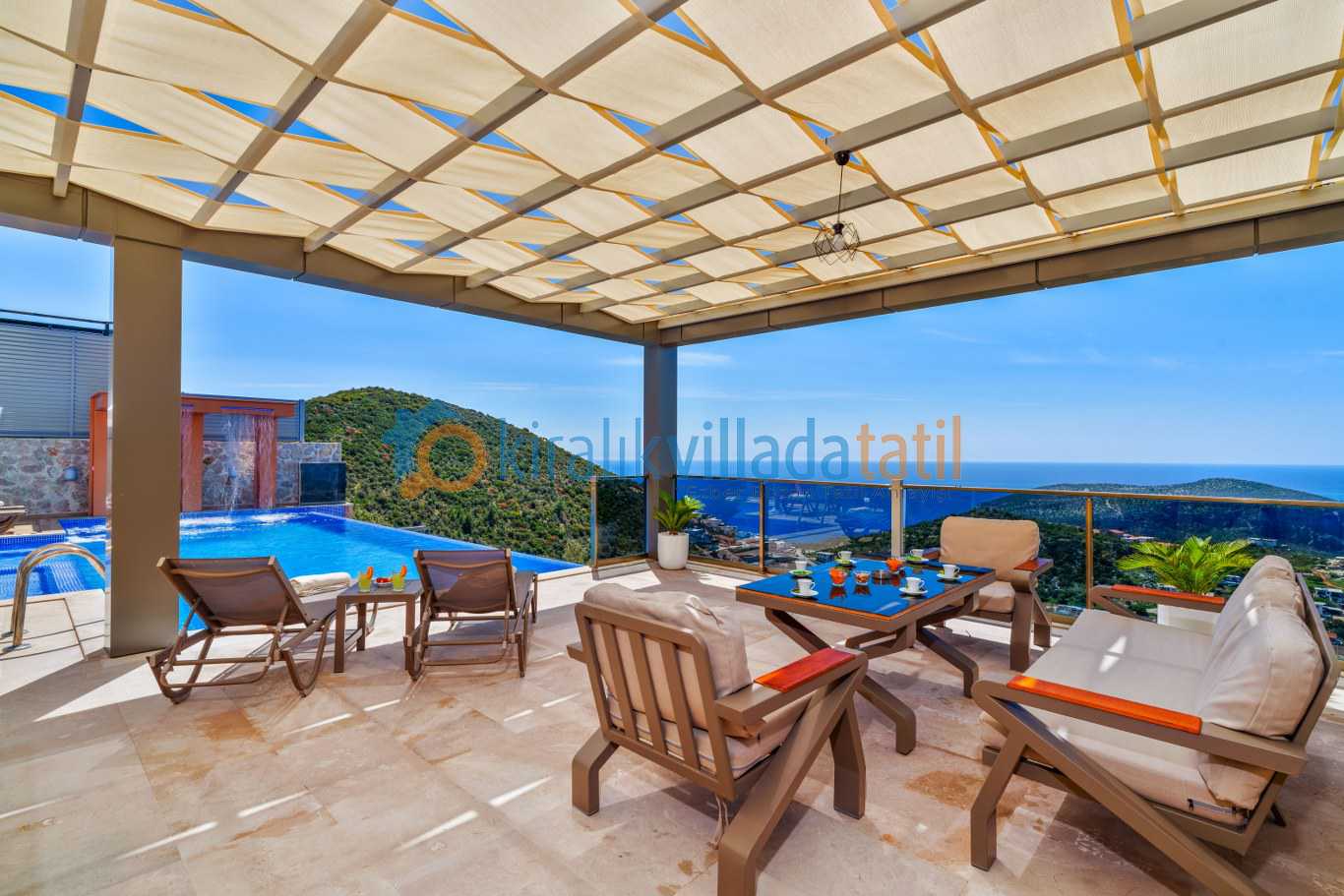 Deniz manzarası ile birleşen geniş teras alanı akşam saatlerinde çok daha etkileyici bir atmosfere dönüşür. Gün batımını izlemek açık havada vakit geçirmek ve sakin bir akşam geçirmek isteyenler için oldukça keyifli bir alan oluşturur. Hem merkezi konumda olup hem de bu kadar özel bir manzara sunması bu lüks villa seçeneğini daha değerli hale getirir. Kalkan’ın canlı yapısına yakın olmak isteyen ama aynı zamanda daha özel bir tatil geçirmek isteyen misafirler için dengeli bir alternatif sunar.