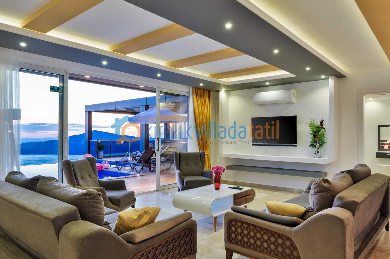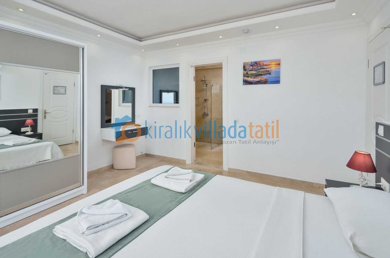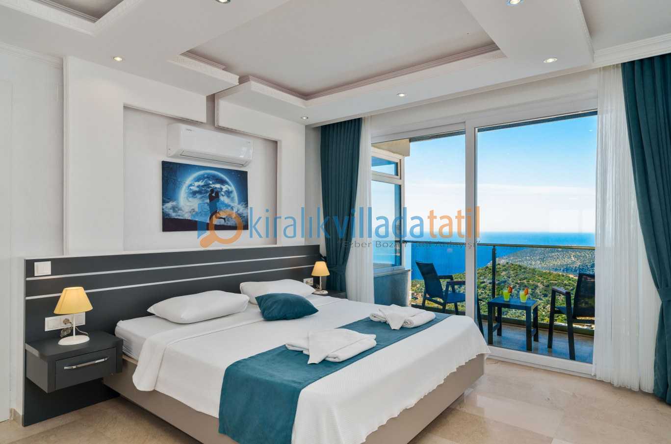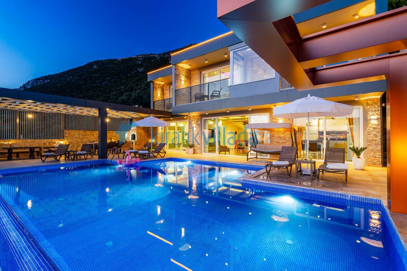 Deniz manzarası ile birleşen geniş teras alanı akşam saatlerinde çok daha etkileyici bir atmosfere dönüşür. Gün batımını izlemek açık havada vakit geçirmek ve sakin bir akşam geçirmek isteyenler için oldukça keyifli bir alan oluşturur. Hem merkezi konumda olup hem de bu kadar özel bir manzara sunması bu lüks villa seçeneğini daha değerli hale getirir. Kalkan’ın canlı yapısına yakın olmak isteyen ama aynı zamanda daha özel bir tatil geçirmek isteyen misafirler için dengeli bir alternatif sunar.